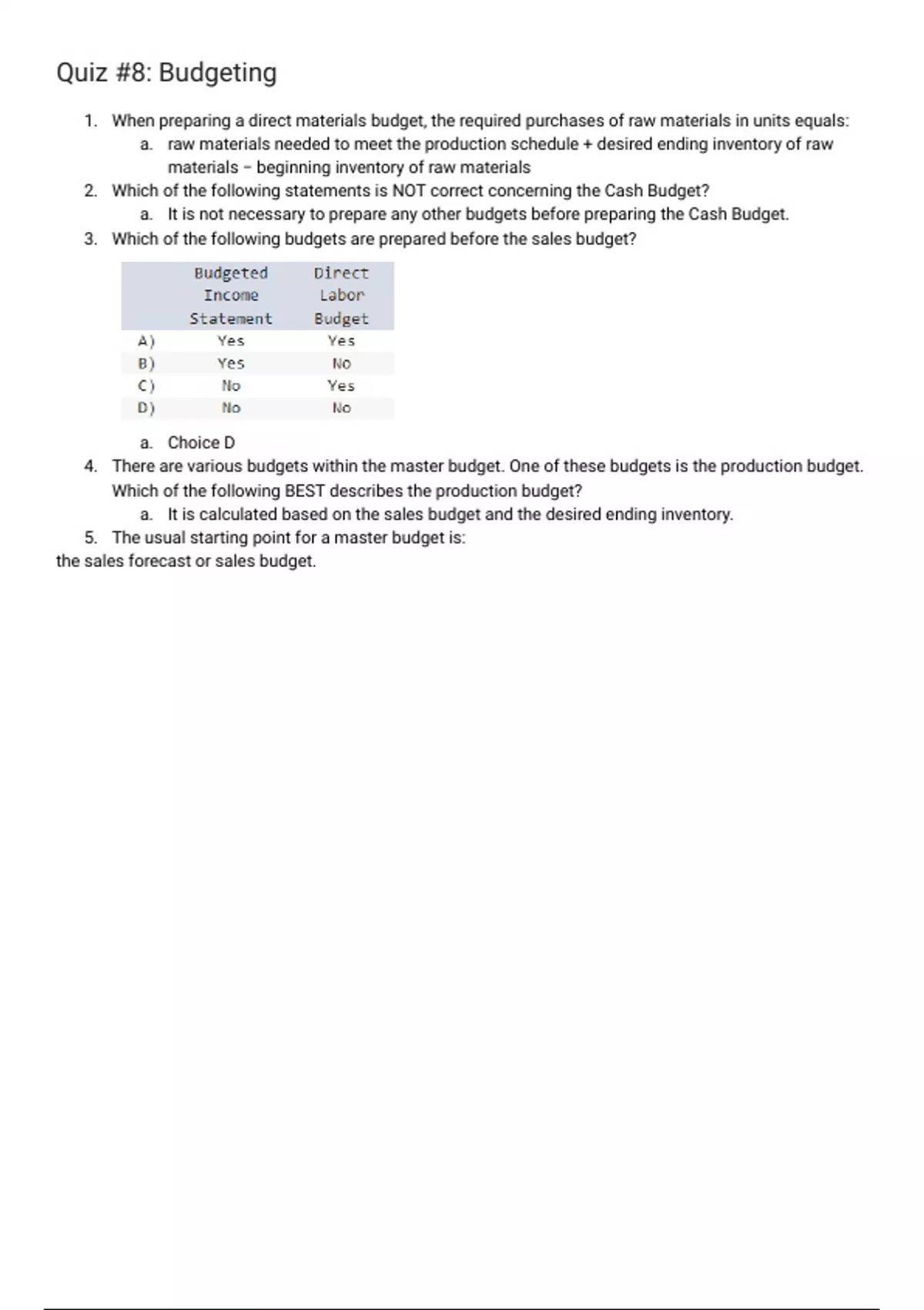 Quiz #8: Budgeting