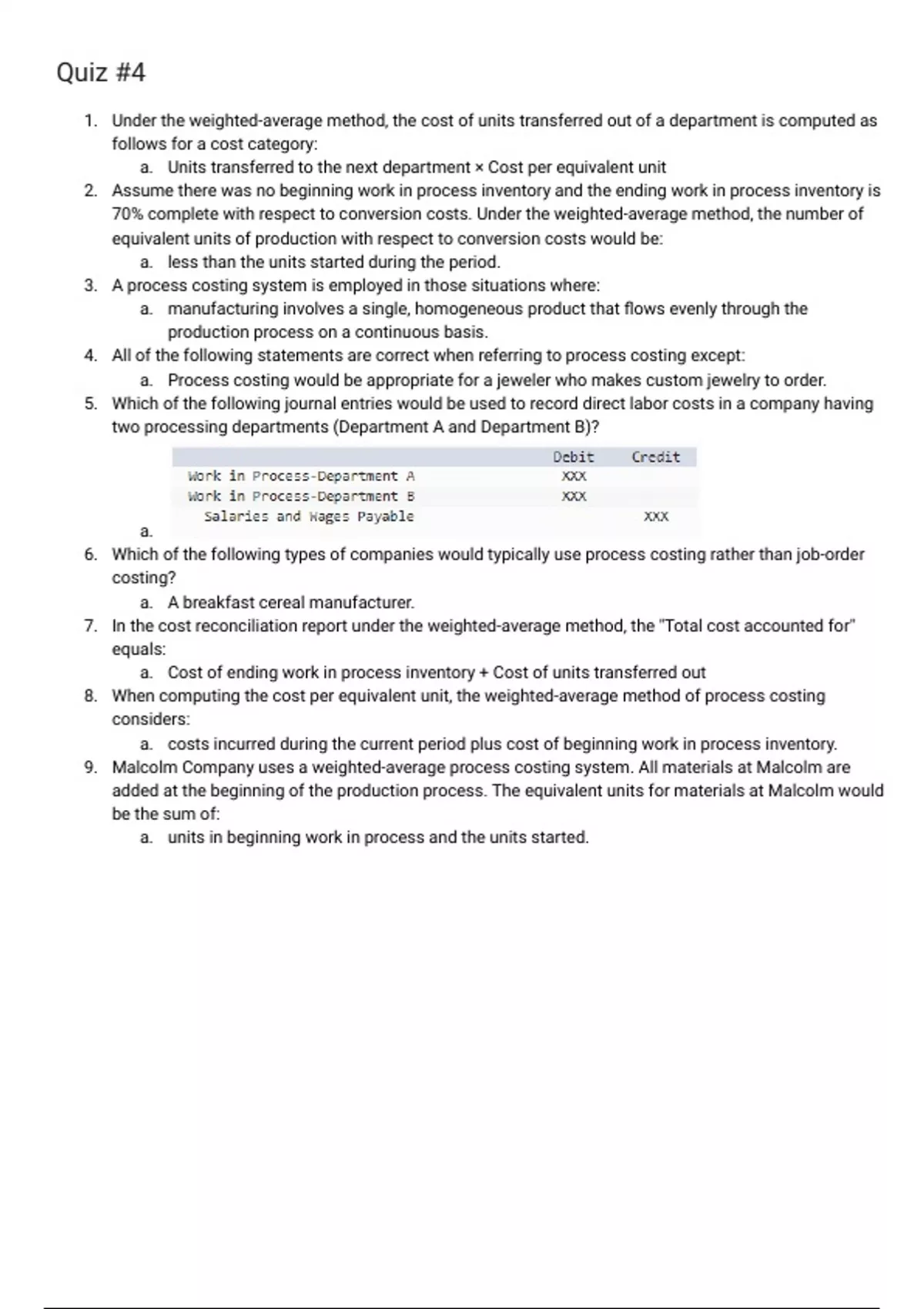 9. Malcolm Company uses a weighted-average process costing system. All materials at Malcolm are