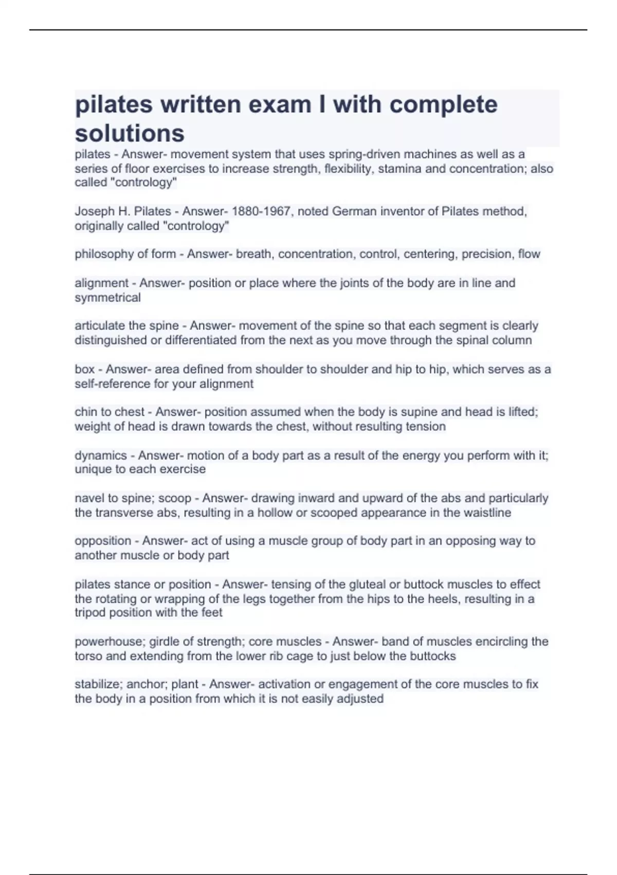 pilates written exam I with complete solutions