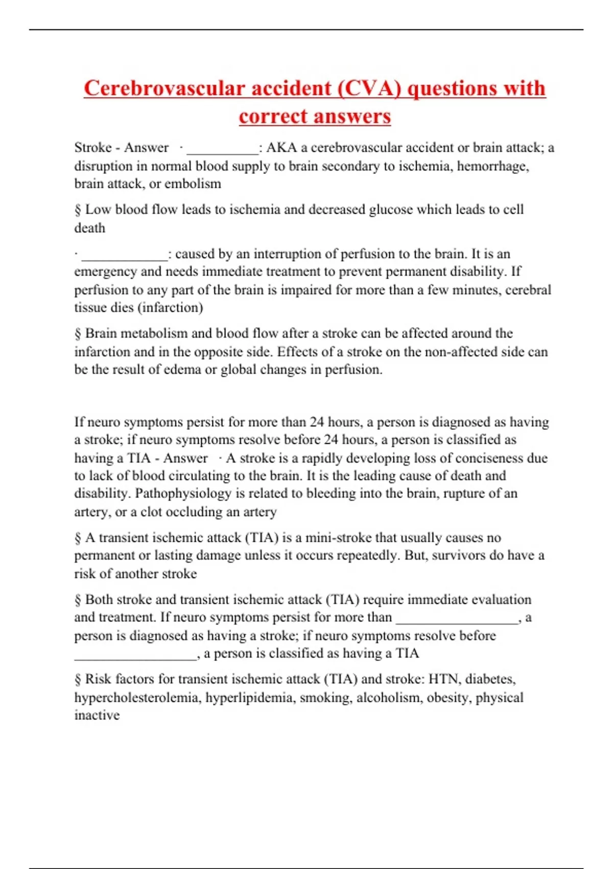 Stroke - Answer · __________: AKA a cerebrovascular accident or brain attack; a disruption in normal blood supply to brain secondary to ischemia, hemorrhage, brain attack, or embolism § Low blood flow leads to ischemia and decreased glucose which leads to cell death · ____________: caused by an interruption of perfusion to the brain. It is an emergency and needs immediate treatment to prevent permanent disability. If perfusion to any part of the brain is impaired for more than a few minutes, cerebral tissue dies (infarction) § Brain metabolism and blood flow after a stroke can be affected around the infarction and in the opposite side. Effects of a stroke on the non-affected side can be the result of edema or global changes in perfusion. If neuro symptoms persist for more than 24 hours, a person is diagnosed as having a stroke; if neuro symptoms resolve before 24 hours, a person is classified as having a TIA - Answer · A stroke is a rapidly developing loss of conciseness due to lack of blood circulating to the brain. It is the leading cause of death and disability. Pathophysiology is related to bleeding into the brain, rupture of an artery, or a clot occluding an artery § A transient ischemic attack (TIA) is a mini-stroke that usually causes no permanent or lasting damage unless it occurs repeatedly. But, survivors do have a risk of another stroke § Both stroke and transient ischemic attack (TIA) require immediate evaluation and treatment. If neuro symptoms persist for more than _________________, a person is diagnosed as having a stroke; if neuro symptoms resolve before _________________, a person is classified as having a TIA § Risk factors for transient ischemic attack (TIA) and stroke: HTN, diabetes, hypercholesterolemia, hyperlipidemia, smoking, alcoholism, obesity, physical inactive