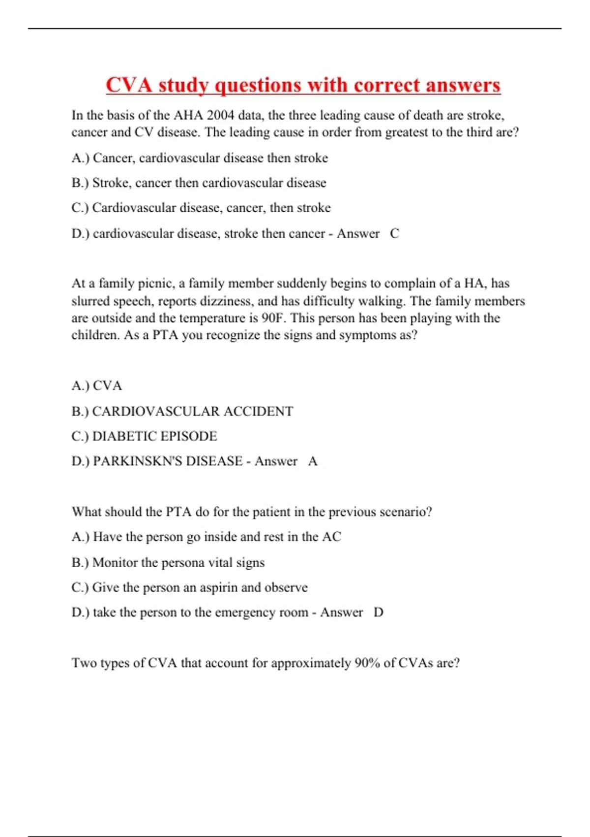 In the basis of the AHA 2004 data, the three leading cause of death are stroke, cancer and CV disease. The leading cause in order from greatest to the third are? A.) Cancer, cardiovascular disease then stroke B.) Stroke, cancer then cardiovascular disease C.) Cardiovascular disease, cancer, then stroke D.) cardiovascular disease, stroke then cancer - Answer C At a family picnic, a family member suddenly begins to complain of a HA, has slurred speech, reports dizziness, and has difficulty walking. The family members are outside and the temperature is 90F. This person has been playing with the children. As a PTA you recognize the signs and symptoms as? A.) CVA B.) CARDIOVASCULAR ACCIDENT C.) DIABETIC EPISODE D.) PARKINSKN'S DISEASE - Answer A What should the PTA do for the patient in the previous scenario? A.) Have the person go inside and rest in the AC B.) Monitor the persona vital signs C.) Give the person an aspirin and observe D.) take the person to the emergency room - Answer D