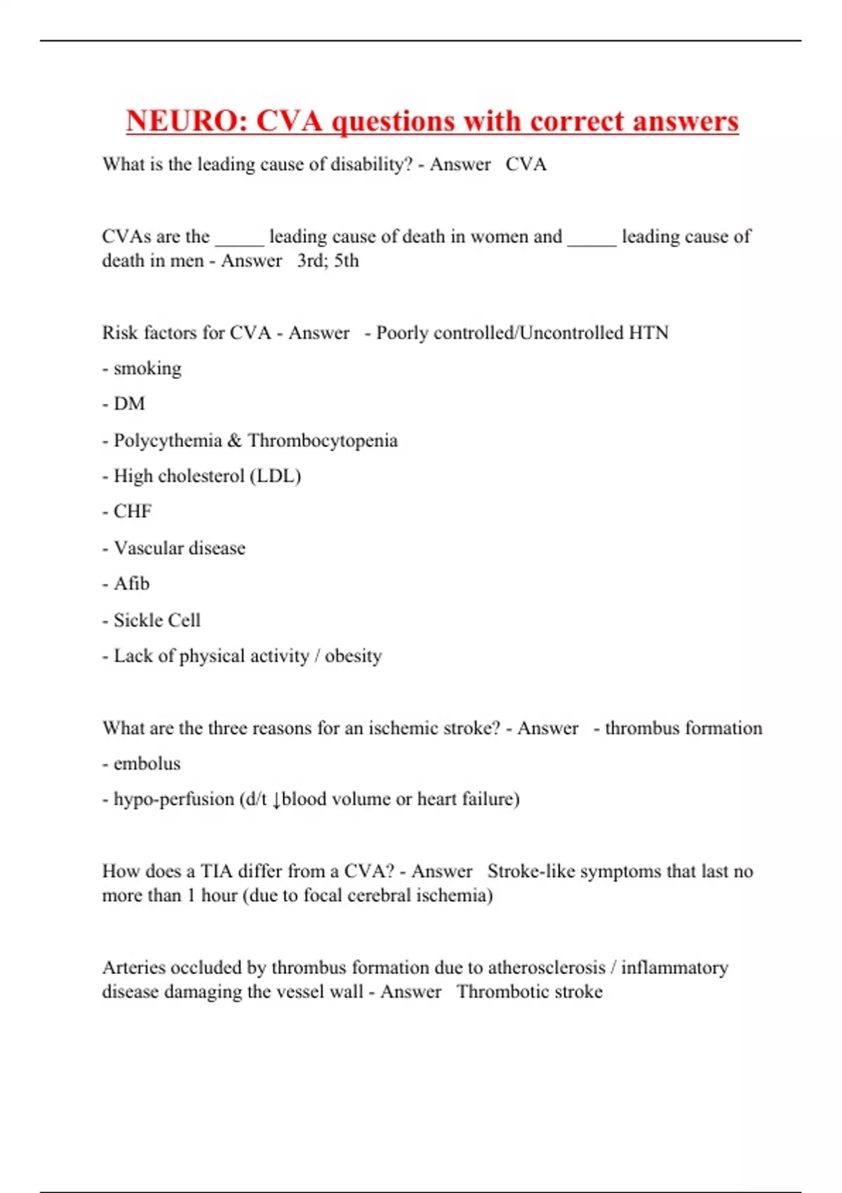 What is the leading cause of disability? - Answer CVA CVAs are the _____ leading cause of death in women and _____ leading cause of death in men - Answer 3rd; 5th Risk factors for CVA - Answer - Poorly controlled/Uncontrolled HTN - smoking - DM - Polycythemia & Thrombocytopenia - High cholesterol (LDL) - CHF - Vascular disease - Afib - Sickle Cell - Lack of physical activity / obesity What are the three reasons for an ischemic stroke? - Answer - thrombus formation - embolus - hypo-perfusion (d/t ↓blood volume or heart failure) How does a TIA differ from a CVA? - Answer Stroke-like symptoms that last no more than 1 hour (due to focal cerebral ischemia) Arteries occluded by thrombus formation due to atherosclerosis / inflammatory disease damaging the vessel wall - Answer Thromboti