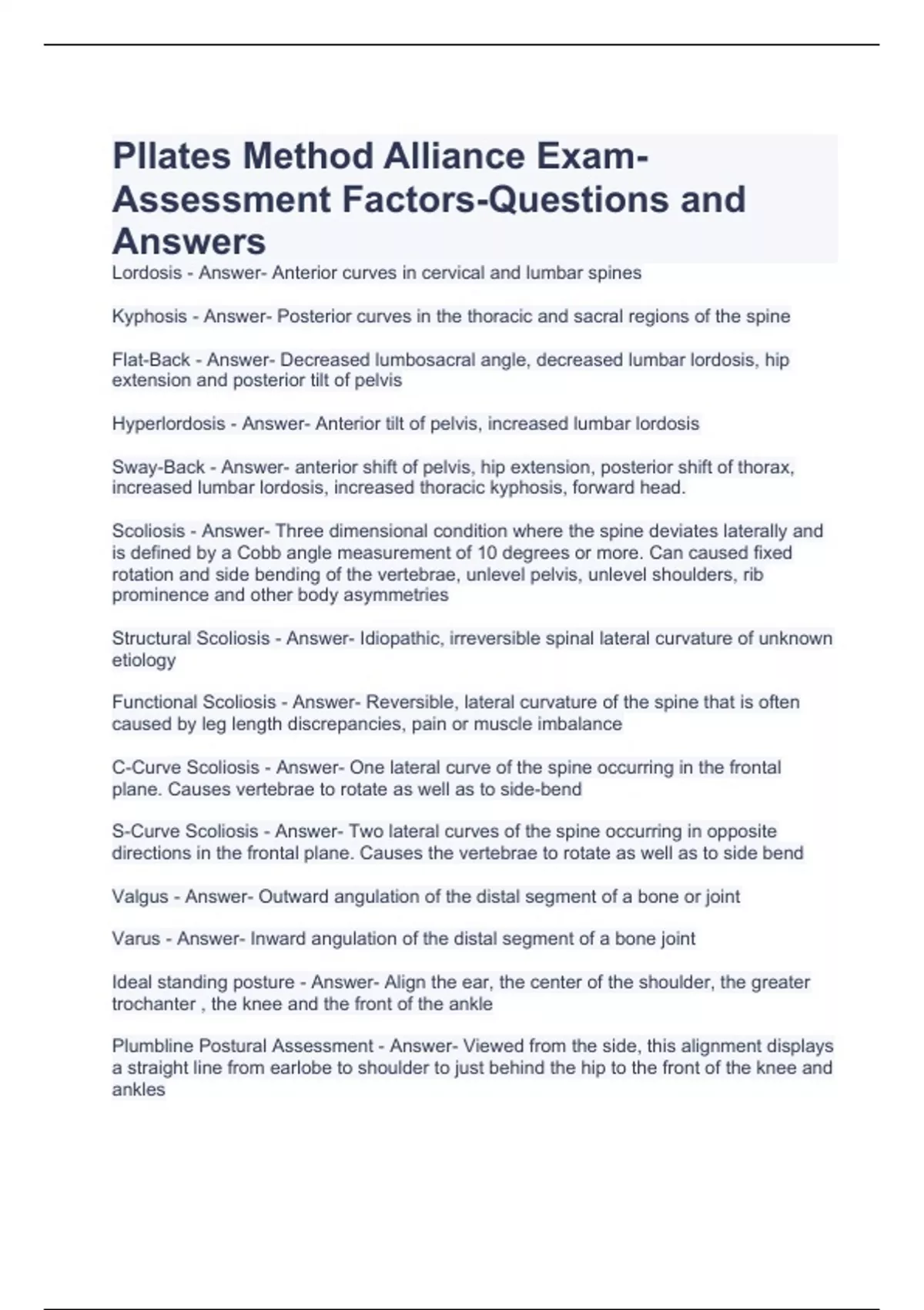 PIlates Method Alliance Exam- Assessment Factors-Questions and Answers Lordosis - Answer- Anterior curves in cervical and lumbar spines Kyphosis - Answer- Posterior curves in the thoracic and sacral regions of the spine Flat-Back - Answer- Decreased lumbosacral angle, decreased lumbar lordosis, hip extension and posterior tilt of pelvis Hyperlordosis - Answer- Anterior tilt of pelvis, increased lumbar lordosis Sway-Back - Answer- anterior shift of pelvis, hip extension, posterior shift of thorax, increased lumbar lordosis, increased thoracic kyphosis, forward head. Scoliosis - Answer- Three dimensional condition where the spine deviates laterally and is defined by a Cobb angle measurement of 10 degrees or more. Can caused fixed rotation and side bending of the vertebrae, unlevel pelvis, unlevel shoulders, rib prominence and other body asymmetries Structural Scoliosis - Answer- Idiopathic, irreversible spinal lateral curvature of unknown etiology Functional Scoliosis - Answer- Reversible, lateral curvature of the spine that is often caused by leg length discrepancies, pain or muscle imbalance C-Curve Scoliosis - Answer- One lateral curve of the spine occurring in the frontal plane. Causes vertebrae to rotate as well as to side-bend S-Curve Scoliosis - Answer- Two lateral curves of the spine occurring in opposite directions in the frontal plane. Causes the vertebrae to rotate as well as to side bend Valgus - Answer- Outward angulation of the distal segment of a bone or joint Varus - Answer- Inward angulation of the distal segment of a bone joint Ideal standing posture - Answer- Align the ear, the center of the shoulder, the greater trochanter , the knee and the front of the ankle Plumbline Postural Assessment - Answer- Viewed from the side, this alignment displays a straight line from earlobe to shoulder to just behind the hip to the front of the knee and ankles Weight bearing - Answer- Weight of body is distributed among 3 points: The tripod of the calcaneus, 1st metatarsal, 5th metatarsal. Posterior Postural View - Answer- Calcaneous, achilles, popliteal fossa, gluteal fold, psis, iliac crest space between ribs and upper extremity, scapular position, head position Anterior Postural View - Answer- Ankle, patella, ASIS, Ribs, clavicle, earlobe, arm length Lateral Postural View - Answer- Front of lateral malleolus, knee joint, greater trochanter, midline of trunk, shoulder, neck, earlobe, hand position Dynamic Assessment - Answer- Assessing coordination and faulty alignment in movement Intake and Interview - Answer- General information, medical history, physical activity, current status Client Goal Establishment - Answer- Meaningful, functionally relevant goals to he client and what they expect from pilates regime