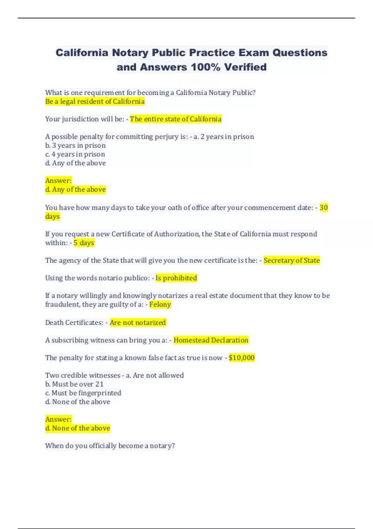 California Notary Public Practice Exam Questions and Answers 100% Verified