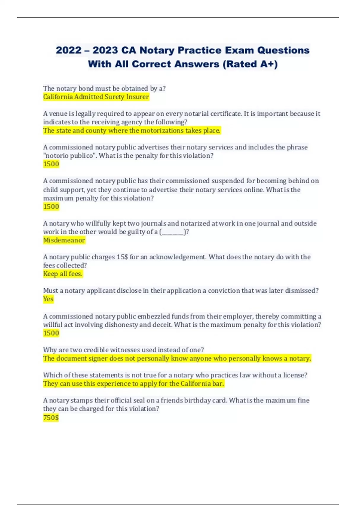 2022 – 2023 CA Notary Practice Exam Questions With All Correct Answers (Rated A+)