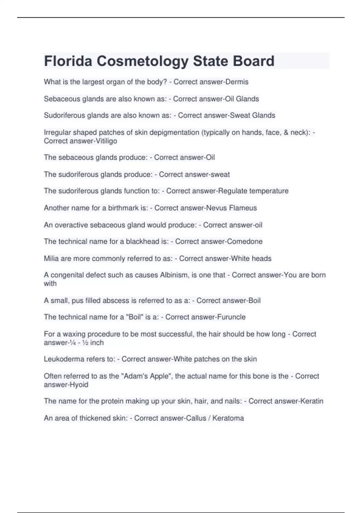 Cosmetology Florida State Board Clinical Exam questions with complete solutions Florida Cosmetology State Board What is the largest organ of the body? - Correct answer-Dermis Sebaceous glands are also known as: - Correct answer-Oil Glands Sudoriferous glands are also known as: - Correct answer-Sweat Glands Irregular shaped patches of skin depigmentation (typically on hands, face, & neck): - Correct answer-Vitiligo The sebaceous glands produce: - Correct answer-Oil The sudoriferous glands produce: - Correct answer-sweat