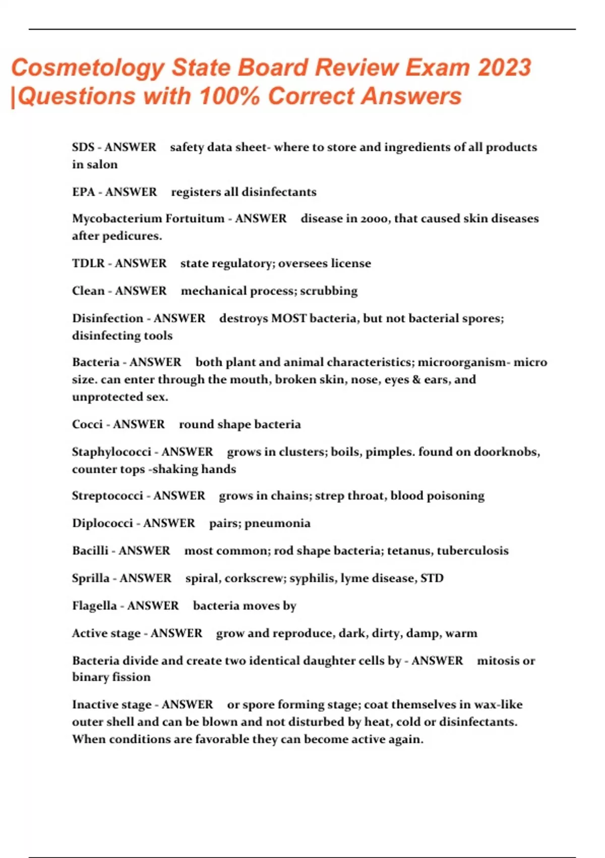 Cosmetology State Board Review Exam 2023 |Questions with 100% Correct Answers SDS - ANSWER safety data sheet- where to store and ingredients of all products in salon EPA - ANSWER registers all disinfectants Mycobacterium Fortuitum - ANSWER disease in 2000, that caused skin diseases after pedicures. TDLR - ANSWER state regulatory; oversees license Clean - ANSWER mechanical process; scrubbing Disinfection - ANSWER destroys MOST bacteria, but not bacterial spores; disinfecting tools Bacteria - ANSWER both plant and animal characteristics; microorganism- micro size. can enter through the mouth, broken skin, nose, eyes & ears, and unprotected sex