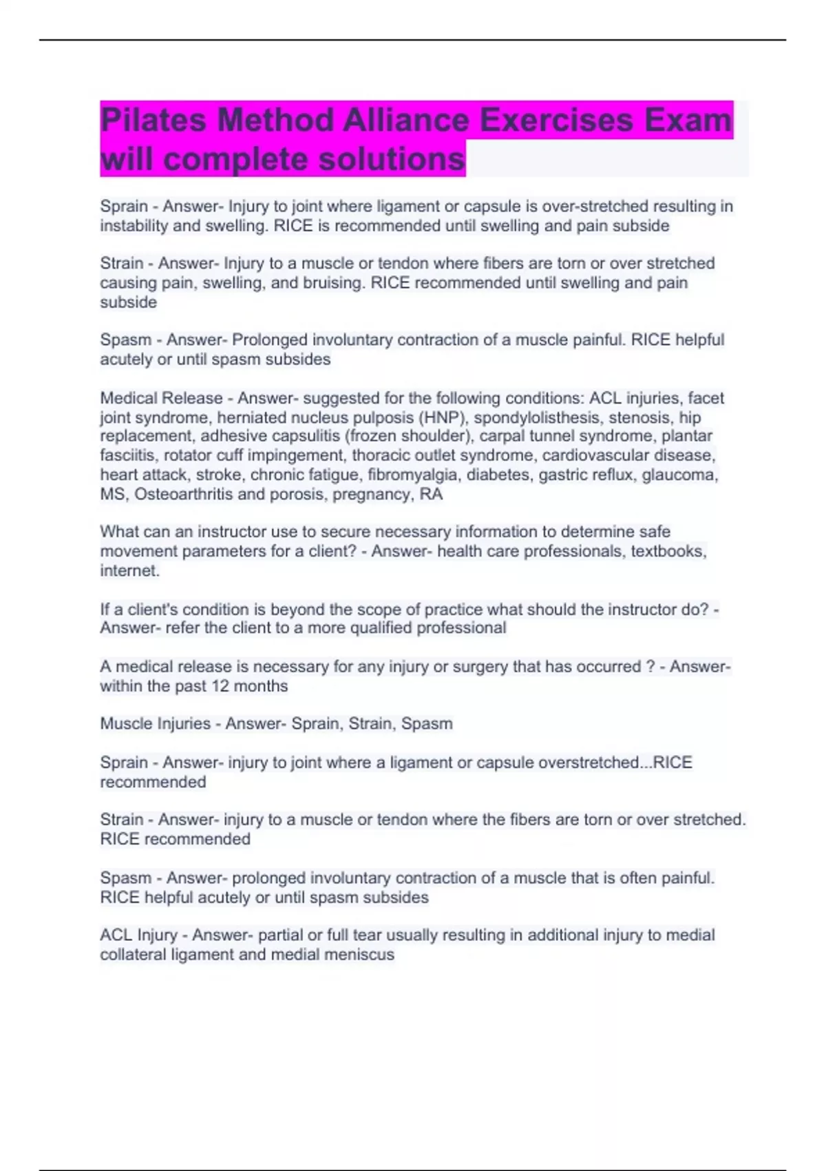 Sprain - Answer- Injury to joint where ligament or capsule is over-stretched resulting in instability and swelling. RICE is recommended until swelling and pain subside Strain - Answer- Injury to a muscle or tendon where fibers are torn or over stretched causing pain, swelling, and bruising. RICE recommended until swelling and pain subside Spasm - Answer- Prolonged involuntary contraction of a muscle painful. RICE helpful acutely or until spasm subsides Medical Release - Answer- suggested for the following conditions: ACL injuries, facet joint syndrome, herniated nucleus pulposis (HNP), spondylolisthesis, stenosis, hip replacement, adhesive capsulitis (frozen shoulder), carpal tunnel syndrome, plantar fasciitis, rotator cuff impingement, thoracic outlet syndrome, cardiovascular disease, heart attack, stroke, chronic fatigue, fibromyalgia, diabetes, gastric reflux, glaucoma, MS, Osteoarthritis and porosis, pregnancy, RA What can an instructor use to secure necessary information to determine safe movement parameters for a client? - Answer- health care professionals, textbooks, internet. If a client's condition is beyond the scope of practice what should the instructor do? - Answer- refer the client to a more qualified professional A medical release is necessary for any injury or surgery that has occurred ? - Answer- within the past 12 months Muscle Injuries - Answer- Sprain, Strain, Spasm Sprain - Answer- injury to joint where a ligament or capsule overstretched...RICE recommended Strain - Answer- injury to a muscle or tendon where the fibers are torn or over stretched. RICE recommended Spasm - Answer- prolonged involuntary contraction of a muscle that is often painful. RICE helpful acutely or until spasm subsides ACL Injury - Answer- partial or full tear usually resulting in additional injury to medial collateral ligament and medial meniscus Without Surgical Repair ACL Injury Contraindications - Answer- without surgical repair no extension with resistance to distal leg. Squatting causes more stress to ACL With Surgical Repair ACL Injury Contraindications - Answer- up to 10 weeks with PT, 10-24 weeks avoid feet in straps or leg spring work Facet Joint Syndrome - Answer- facet lock of spine and often occurs with or because of disc degeneration...creates pain with extension combined with rotation and side bending Facet Joint Syndrome Contraindications - Answer- avoid extension of the spine Herniated Nucleus Pulposis (HNP) (herniated or bulging disc) - Answer- annular fibers weakened, nucleus loses volume and narrows What are the three stages of HNP - Answer- 1. Disc Bulge 2. Prolapsed Disc 3. Sequestration Symptoms of HNP - Answer- peripheral pain or numbness/tingling in buttocks, thigh, calf or toe; in more severe cases lower extremity weakness and/or loss of deep tendon reflexes HNP Contraindications - Answer- avoid all exercises that include spinal flexion or vertical loading (seated, standing, or inverted positions) of the spine. Avoid exercise that involves a straight leg raise or strong spinal rotation Spondylolisthesis - Answer- instability at L5-S1 or L4-5 due to defect in laminae that cause anterior vertebral displacement Symptoms of Spondylolisthesis - Answer- minor acute pain with diffuse radiation into buttocks , major fractures in the laminae and can cause serious spinal cord injuries Spondylolisthesis Contraindications - Answer- avoid extension of spine in segment of spine where it occurs Stenosis - Answer- narrowing of the spinal canal (central stenosis) or nerve root canals (lateral stenosis) Occurring in the lumbar spine but can occur in cervical or thoracic Stenosis Symptoms - Answer- 1. Lumbar - back pain, tingling, motor deficits and intermittent pain in one or both legs worsened by standing or walking 2. Cervical- radiating pain in upper extremities 3. Thoracic- radiating pain around the ribcage Stenosis Contraindications - Answer- avoid extension of the stenotic segment of the spine Total Hip Replacement - Answer- acetabulu