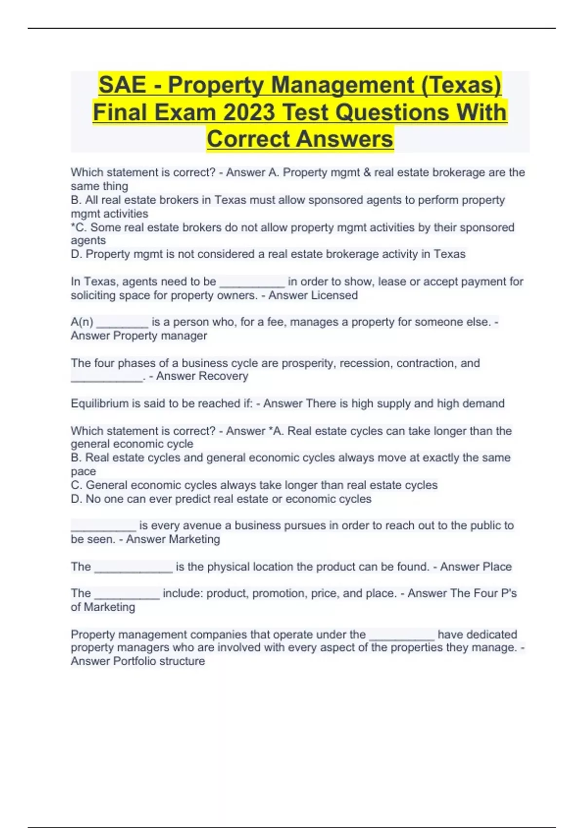 SAE - Property Management (Texas) Final Exam 2023 Test Questions With Correct Answers
