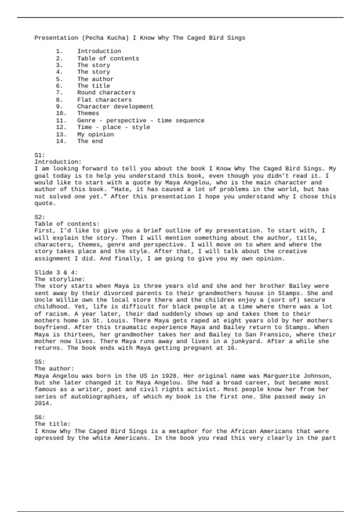Presentation (Pecha Kucha) I Know Why The Caged Bird Sings