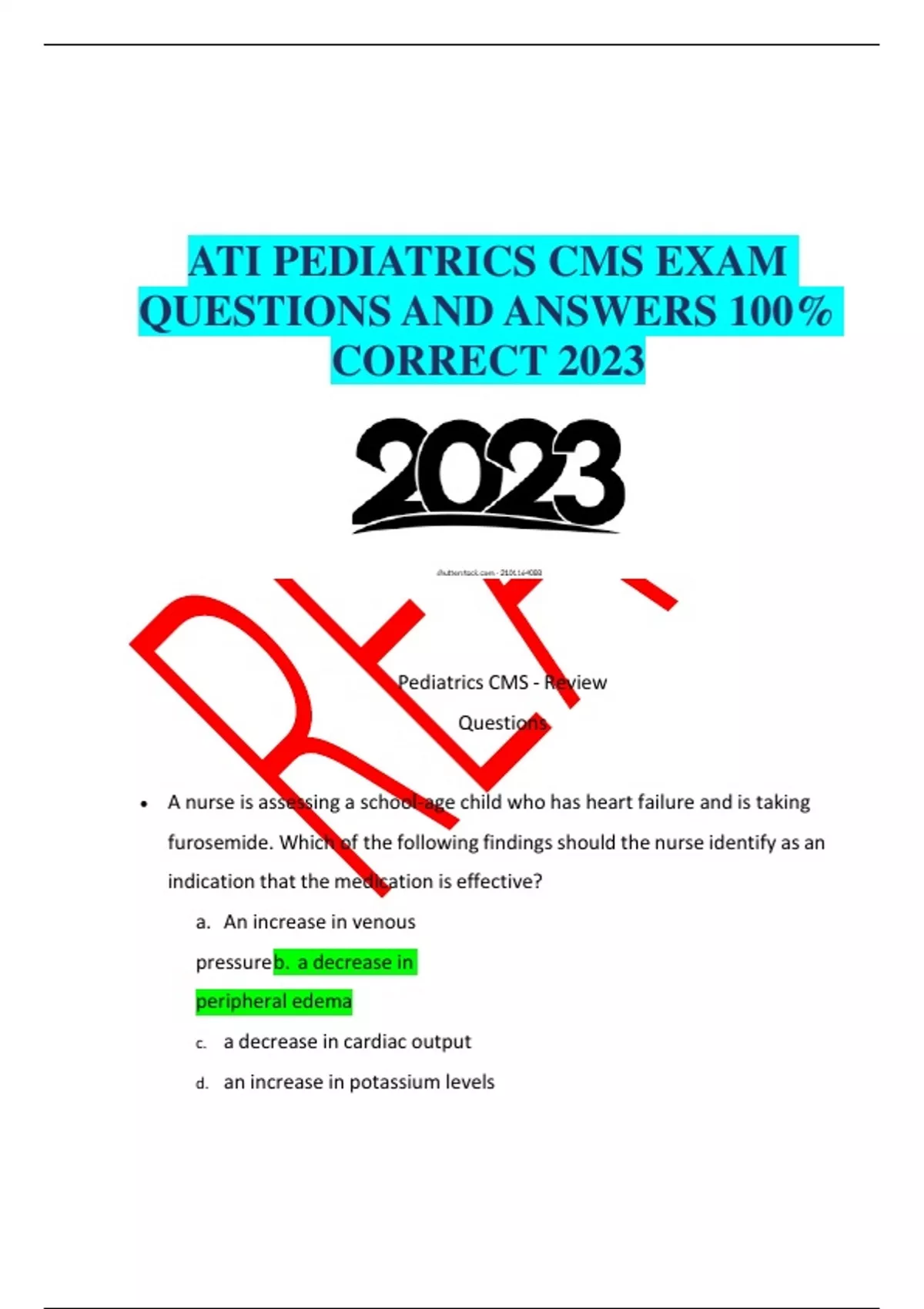 ATI PEDIATRICS CMS EXAM QUESTIONS AND ANSWERS 100% CORRECT 2023• A nurse is assessing a school-age child who has heart failure and is taking furosemide. Which of the following findings should the nurse identify as an indication that the medication is effective? a. An increase in venous pressure b. a decrease in peripheral edema c. a decrease in cardiac output d. an increase in potassium levels • A nurse is assessing an infant who has acute otitis media. Which of the following findings should the nurse expect (select all that apply). a. Increased appetite b. enlarged subclavian lymph node c. Crying d. Restlessness e. Fever • A nurse is assessing an infant who has severe dehydration due to gastroenteritis which of the following findings should the nurse expect? a. Increased respiratory rate b. capillary refill of 2 seconds c. Hypertension d. increased urine output