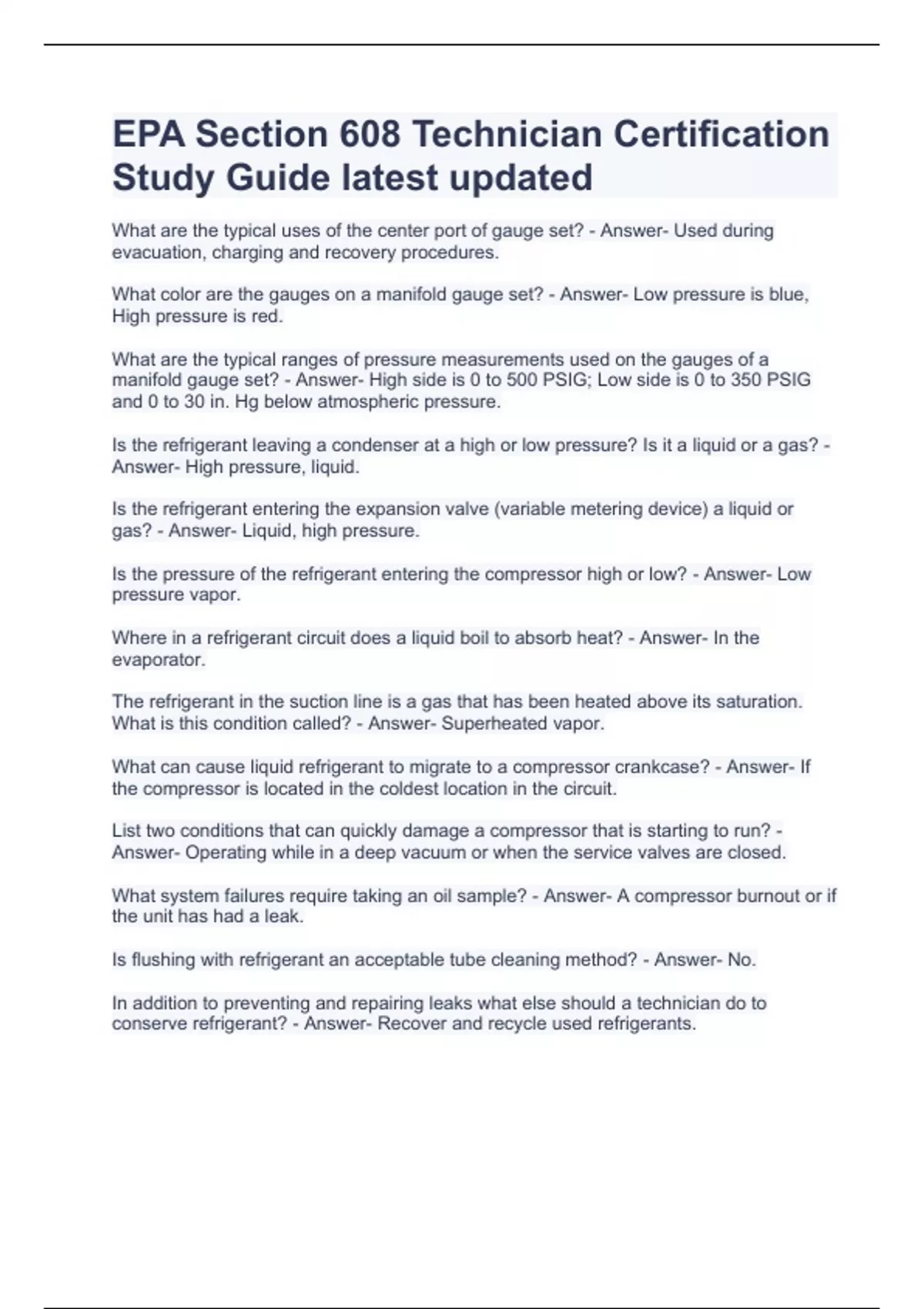 What are the typical uses of the center port of gauge set? - Answer- Used during evacuation, charging and recovery procedures. What color are the gauges on a manifold gauge set? - Answer- Low pressure is blue, High pressure is red. What are the typical ranges of pressure measurements used on the gauges of a manifold gauge set? - Answer- High side is 0 to 500 PSIG; Low side is 0 to 350 PSIG and 0 to 30 in. Hg below atmospheric pressure. Is the refrigerant leaving a condenser at a high or low pressure? Is it a liquid or a gas? - Answer- High pressure, liquid. Is the refrigerant entering the expansion valve (variable metering device) a liquid or gas? - Answer- Liquid, high pressure. Is the pressure of the refrigerant entering the compressor high or low? - Answer- Low pressure vapor. Where in a refrigerant circuit does a liquid boil to absorb heat? - Answer- In the evaporator. The refrigerant in the suction line is a gas that has been heated above its saturation. What is this condition called? - Answer- Superheated vapor. What can cause liquid refrigerant to migrate to a compressor crankcase? - Answer- If the compressor is located in the coldest location in the circuit. List two conditions that can quickly damage a compressor that is starting to run? - Answer- Operating while in a deep vacuum or when the service valves are closed. What system failures require taking an oil sample? - Answer- A compressor burnout or if the unit has had a leak. Is flushing with refrigerant an acceptable tube cleaning method? - Answer- No. In addition to preventing and repairing leaks what else should a technician do to conserve refrigerant? - Answer- Recover and recycle used refrigerants. What factors affect the speed of an evacuation? - Answer- Pump size, hose length, hose diameter, size of system to be evacuated, ambient temperature, suction line size, and the amount of moisture in the system. How should gauge set hoses be sized for use in evacuating a system? - Answer- Use the shortest length and the largest diameter possible for the quickest evacuation. At least as large as the vacuum pump inlet. When evacuating what is the benefit of using short hoses with large diameters? - Answer- Reduces emissions, pressure drop and evacuation time. Which connection determines the preferred size of hoses used with a vacuum pump? - Answer- The vacuum pump inlet. As the capacity and suction hose size increase what happens to the time needed for an evacuation? - Answer- Time is reduced. What purpose is served by heating a system during dehydration? - Answer- To speed up moisture removal. Does a thorough evacuation remove moisture from a system? - Answer- Yes. What can happen to oil in the compressor if the moisture is left in an operating system? - Answer- The oil will form hydrofluoric and hydrochloric acids which will corrode the internal parts of the system. What is the result of over-evacuating a system? - Answer- No damage will be done. How can a system be leak checked using a low pressure gauge? - Answer- Vacuum reading will rise when vacuum pump is turned off. How close should the vacuum gauge be connected to the vacuum pump during evacuation? - Answer- As far away as possible. When measuring the vacuum of a system being evacuated the system must be isolated. What must be done to the vacuum pump? - Answer- Turn it off and valve it off. What is ozone? - Answer- 3 atoms of oxygen. It blocks much of the harmful ultraviolet radiation (uv-b) emitted from the sun and it keeps our earth's temperature stable. How much ozone can a chlorine atom destroy in the stratosphere? - Answer- One atom can destroy 100,000 ozone molecules. What is Ozone Depletion Potential (ODP)? - Answer- The ability of any chemical to deplete the ozone layer. What is CFC? - Answer- Chlorofluorocarbon. Which refrigerants are CFC's? - Answer- R-11,12,113,114. Which chemical in the CFC refrigerants does the most damage to the ozone layer? - Answer- Chlorine. What is an HCFC? - Answer- Hydrochlorofluorocarbons. Which refrigerants are HCFC's? - Answer- R-22,123. Which is more harmful to the ozone layer a CFC or an HCFC? - Answer- CFC's. What is it about CFC's that make them more harmful to the stratosphere? - Answer- Chemical strength, they will not breakdown in the lower atmosphere. What is an HFC? - Answer- A fluorocarbon that contains no chlorine. Which refrigerants are HFC's? - Answer- R-134a,404a,407c,410a. What is the ODP of the HFC refrigerant? - Answer- Zero. Which refrigerants contain chlorine? - Answer- CFC's and HCFC's. Which refrigerants have high ODP? - Answer- CFC's. Which refrigerants have low ODP? - Answer- HCFC's, HFC's are zero. What is an azeotrope refrigerant? - Answer- A mixture of two or more compounds where the mixture behaves like a single chemical. Is one of the components of R-500 a CFC? - Answer- Yes Does stratospheric ozone help or hurt the work of the earth's protective shield? - Answer- It helps. What chemical in the stratosphere tells us ozone depletion is occurring? - Answer- Chlorine-monoxide. How do we know the chlorine in the stratosphere is coming from CFC's? - Answer- The increase in chlorine and fluorine present in the stratosphere, matches the increase in emissions of CFC's.