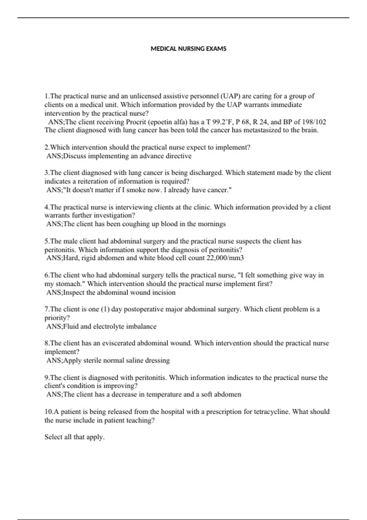 surgical nursing exams with verified answers. 1.The practical nurse and an unlicensed assistive personnel (UAP) are caring for a group of clients on a medical unit. Which information provided by the UAP warrants immediate intervention by the practical nurse? ANS;The client receiving Procrit (epoetin alfa) has a T 99.2˚F, P 68, R 24, and BP of 198/102 The client diagnosed with lung cancer has been told the cancer has metastasized to the brain. 2.Which intervention should the practical nurse expect to implement? ANS;Discuss implementing an advance directive 3.The client diagnosed with lung cancer is being discharged. Which statement made by the client indicates a reiteration of information is required? ANS;"It doesn't matter if I smoke now. I already have cancer." 4.The practical nurse is interviewing clients at the clinic. Which information provided by a client warrants further investigation? ANS;The client has been coughing up blood in the mornings 5.The male client had abdominal surgery and the practical nurse suspects the client has peritonitis. Which information support the diagnosis of peritonitis? ANS;Hard, rigid abdomen and white blood cell count 22,000/mm3