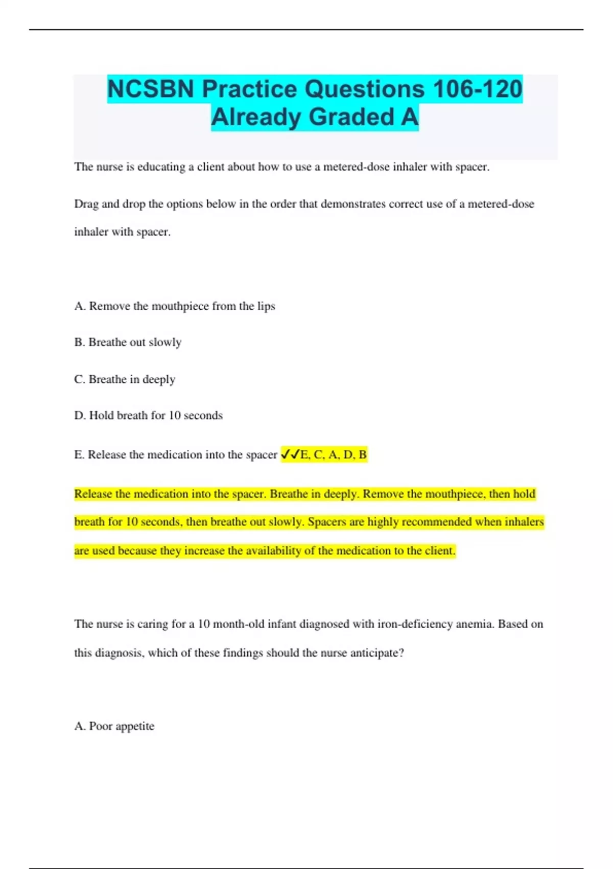 NCSBN Practice Questions 106-120 Already Graded A The nurse is educating a client about how to use a metered-dose inhaler with spacer. Drag and drop the options below in the order that demonstrates correct use of a metered-dose inhaler with spacer. A. Remove the mouthpiece from the lips B. Breathe out slowly C. Breathe in deeply D. Hold breath for 10 seconds E. Release the medication into the spacer E, C, A, D, B Release the medication into the spacer. Breathe in deeply. Remove the mouthpiece, then hold breath for 10 seconds, then breathe out slowly. Spacers are highly recommended when inhalers are used because they increase the availability of the medication to the client. The nurse is caring for a 10 month-old infant diagnosed with iron-deficiency anemia. Based on this diagnosis, which of these findings should the nurse anticipate? A. Poor appetite B. Hemoglobin level of 12 g/dL C. A heart rate between 80 and 130 D. Pale mucosa of the eyelids and lips D In iron-deficiency anemia, the physical exam reveals a pale, tired-appearing infant with mild-to-severe tachycardia. The normal heart rate of infants typically ranges from 120 to 180 BPM. The normal hemoglobin range for children is about 11 to 13 gm/dL. The clinic nurse is caring for a 15 month-old child with a first episode of otitis media. Which intervention should the nurse include in the instructions to the child's parents? A. Explain that the child should complete the full five days of antibiotics B. Describe the tympanocentesis to detect persistent infections C. Emphasize the importance of a return visit after completion of antibiotics D. Provide them with handout describing care of myringotomy tubes C The usual treatment for otitis media is oral antibiotics for 10 to 14 days. The child should be examined again after completion of the full course of antibiotics to assess for persistent infection or middle ear effusion. A client is admitted to a voluntary hospital mental health unit with the diagnosis of suicidal ideation. The client has been on the unit for two days and now state