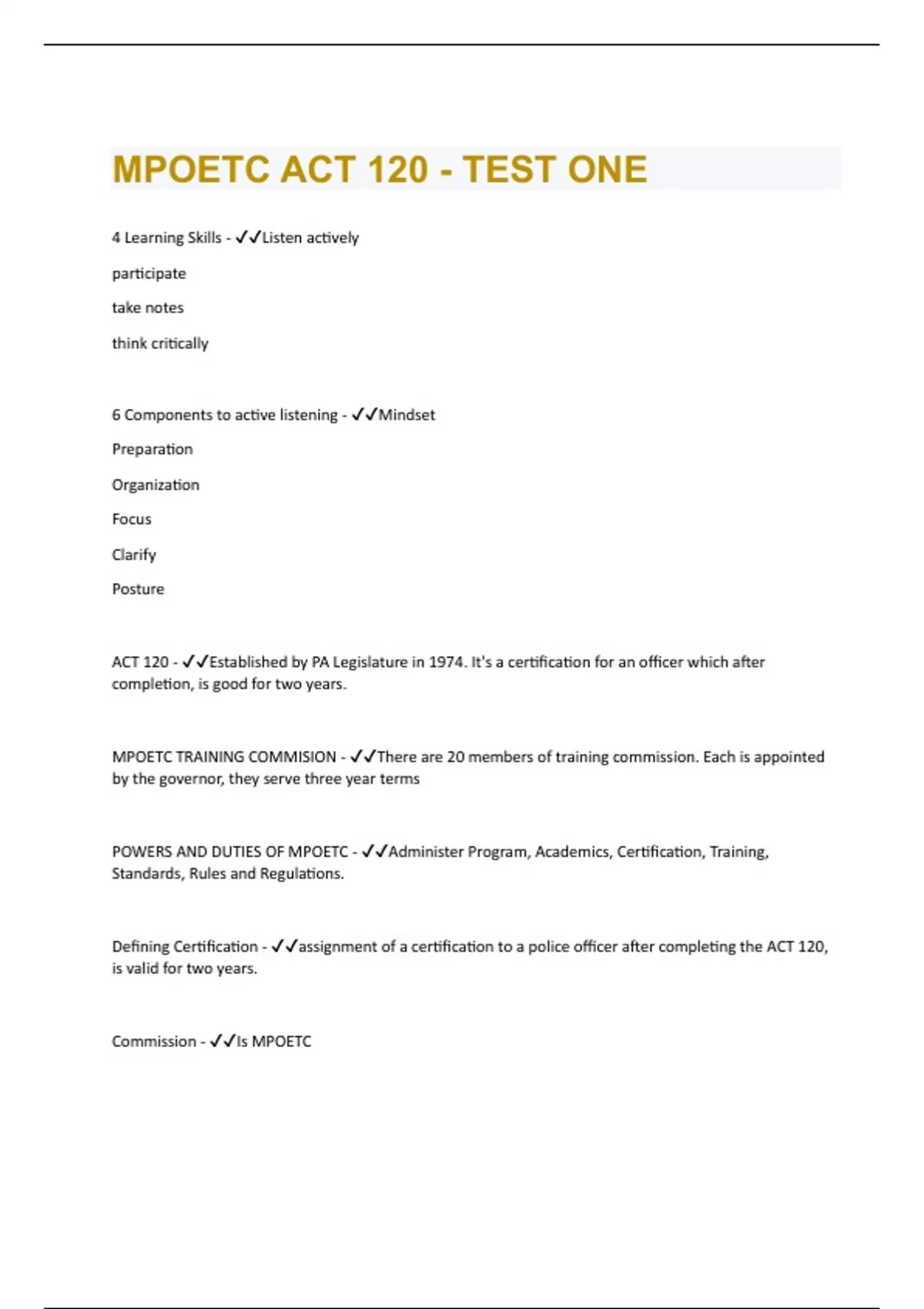 4 Learning Skills - Listen actively participate take notes think critically 6 Components to active listening - Mindset Preparation Organization Focus Clarify Posture ACT 120 - Established by PA Legislature in 1974. It's a certification for an officer which after completion, is good for two years. MPOETC TRAINING COMMISION - There are 20 members of training commission. Each is appointed by the governor, they serve three year terms POWERS AND DUTIES OF MPOETC - Administer Program, Academics, Certification, Training, Standards, Rules and Regulations. Defining Certification - assignment of a certification to a police officer after completing the ACT 120, is valid for two years. Commission - Is MPOETCCommissioner - is the commissioner of PSP (PA state police) Police Department - A public agency having general police powers and charged with making arrests in connection with the enforcement of criminal or traffic laws. It includes the sheriff's office and university police. Police officer - An employee assigned to criminal or traffic law enforcement Commission members - 20 members,etc (SEE PAGE 13 for remaining) PSP Commissioner is chairman, Attorney General police commisioner of a city of the first class. Commission power and duties - a. Administer program b. Academies c. Certification d. Training e. Standards f. Rules and regulations PA CRIMES CODE - TITLE 18 PA VEHICLE CODE - TITLE 75 Systems that assist in maintenance of order. - Value System Moral System Belief System Power - Derived from the constitutional authority of government