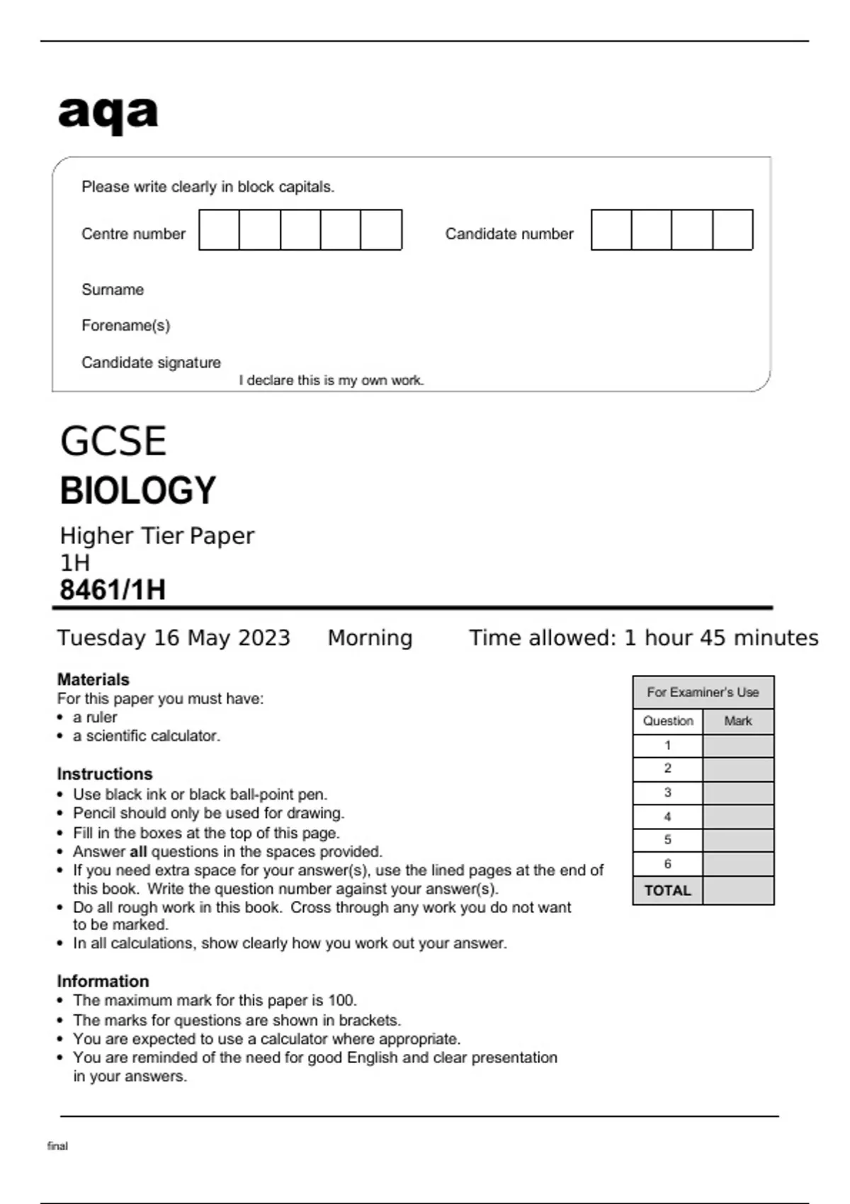 Aqa GCSE Biology 8461/1H May2023 Question Paper