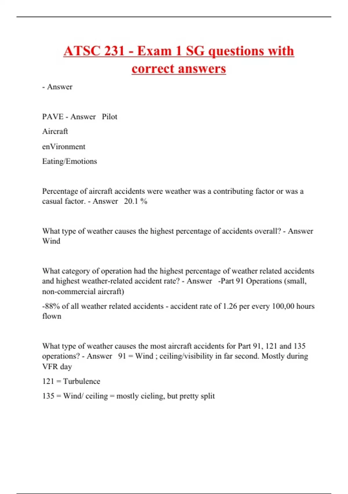 - Answer PAVE - Answer Pilot Aircraft enVironment Eating/Emotions Percentage of aircraft accidents were weather was a contributing factor or was a casual factor. - Answer 20.1 % What type of weather causes the highest percentage of accidents overall? - Answer Wind What category of operation had the highest percentage of weather related accidents and highest weather-related accident rate? - Answer -Part 91 Operations (small, non-commercial aircraft) -88% of all weather related accidents - accident rate of 1.26 per every 100,00 hours flown What type of weather causes the most aircraft accidents for Part 91, 121 and 135 operations? - Answer 91 = Wind ; ceiling/visibility in far second. Mostly during VFR day 121 = Turbulence 135 = Wind/ ceiling = mostly cieling, but pretty split