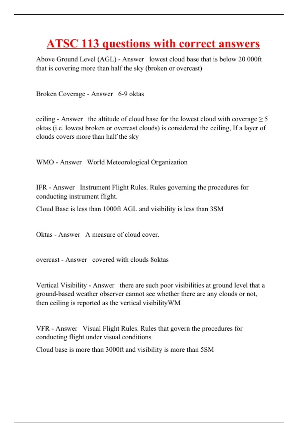Above Ground Level (AGL) - Answer lowest cloud base that is below 20 000ft that is covering more than half the sky (broken or overcast) Broken Coverage - Answer 6-9 oktas ceiling - Answer the altitude of cloud base for the lowest cloud with coverage ≥ 5 oktas (i.e. lowest broken or overcast clouds) is considered the ceiling, If a layer of clouds covers more than half the sky WMO - Answer World Meteorological Organization IFR - Answer Instrument Flight Rules. Rules governing the procedures for conducting instrument flight. Cloud Base is less than 1000ft AGL and visibility is less than 3SM Oktas - Answer A measure of cloud cover. overcast - Answer covered with clouds 8oktas Vertical Visibility - Answer there are such poor visibilities at ground level that a ground-based weather observer cannot see whether there are any clouds or not, then ceiling is reported as the vertical visibilityWM VFR - Answer Visual Flight Rules. Rules that govern the procedures for conducting flight under visual conditions. Cloud base is more than 3000ft and visibility is more than 5SM