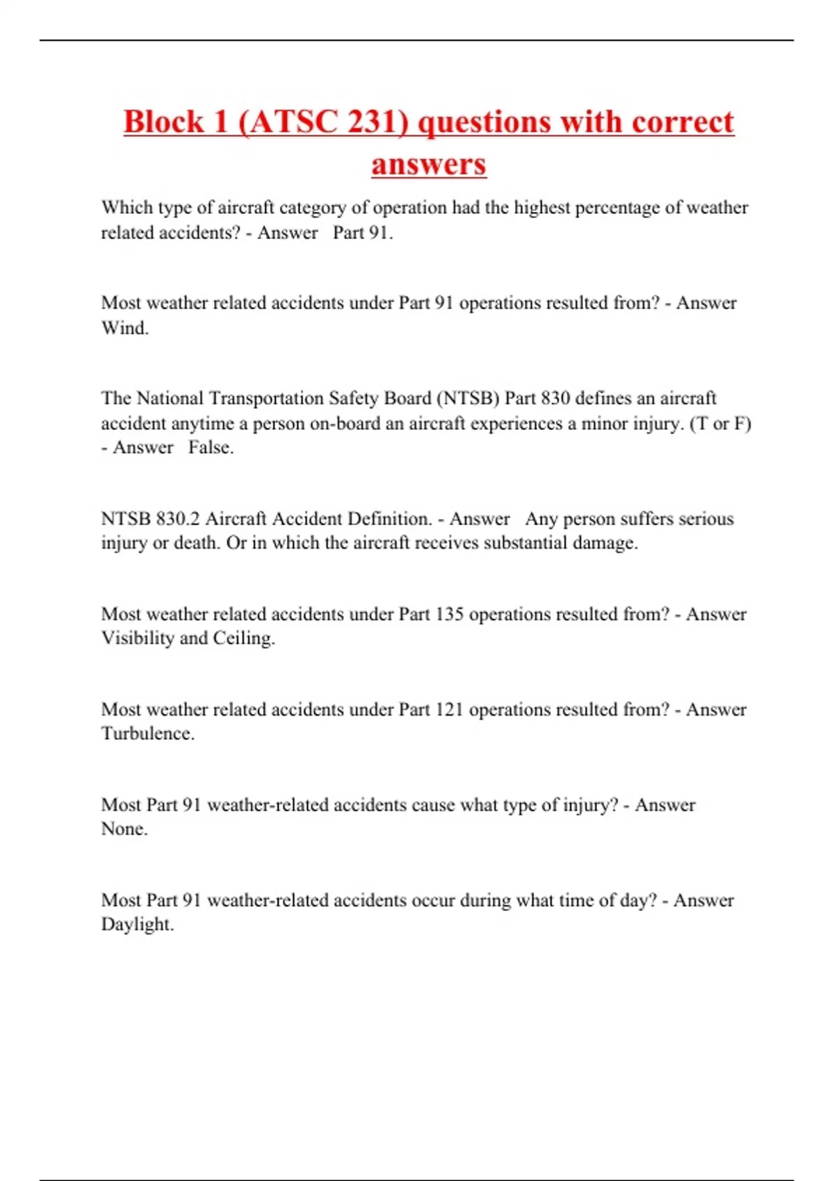 Which type of aircraft category of operation had the highest percentage of weather related accidents? - Answer Part 91. Most weather related accidents under Part 91 operations resulted from? - Answer Wind. The National Transportation Safety Board (NTSB) Part 830 defines an aircraft accident anytime a person on-board an aircraft experiences a minor injury. (T or F) - Answer False. NTSB 830.2 Aircraft Accident Definition. - Answer Any person suffers serious injury or death. Or in which the aircraft receives substantial damage. Most weather related accidents under Part 135 operations resulted from? - Answer Visibility and Ceiling. Most weather related accidents under Part 121 operations resulted from? - Answer Turbulence.