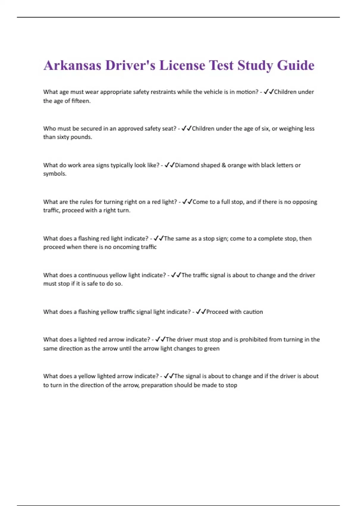 What age must wear appropriate safety restraints while the vehicle is in motion? - Children under the age of fifteen. Who must be secured in an approved safety seat? - Children under the age of six, or weighing less than sixty pounds. What do work area signs typically look like? - Diamond shaped & orange with black letters or symbols. What are the rules for turning right on a red light? - Come to a full stop, and if there is no opposing traffic, proceed with a right turn. What does a flashing red light indicate? - The same as a stop sign; come to a complete stop, then proceed when there is no oncoming traffic What does a continuous yellow light indicate? - The traffic signal is about to change and the driver must stop if it is safe to do so. What does a flashing yellow traffic signal light indicate? - Proceed with caution What does a lighted red arrow indicate? - The driver must stop and is prohibited from turning in the same direction as the arrow until the arrow light changes to green What does a yellow lighted arrow indicate? - The signal is about to change and if the driver is about to turn in the direction of the arrow, preparation should be made to stopWhat rules govern turning left from a one-way street into another one-way street? - You can turn even if the traffic signal is red (unless a traffic sign is posted prohibiting it), but only after the driver has come to a complete stop and yields any opposing traffic within the intersection What do warning signs look like? - Yellow with black letterings or symbols; most are diamond shaped What does a white X-shape "crossbuck" sign mean? - Yield at the railroad crossing to trains What do regulation signs look like? - White with black print, sometimes with a red circle and slash. They include lane control signs and passing signs