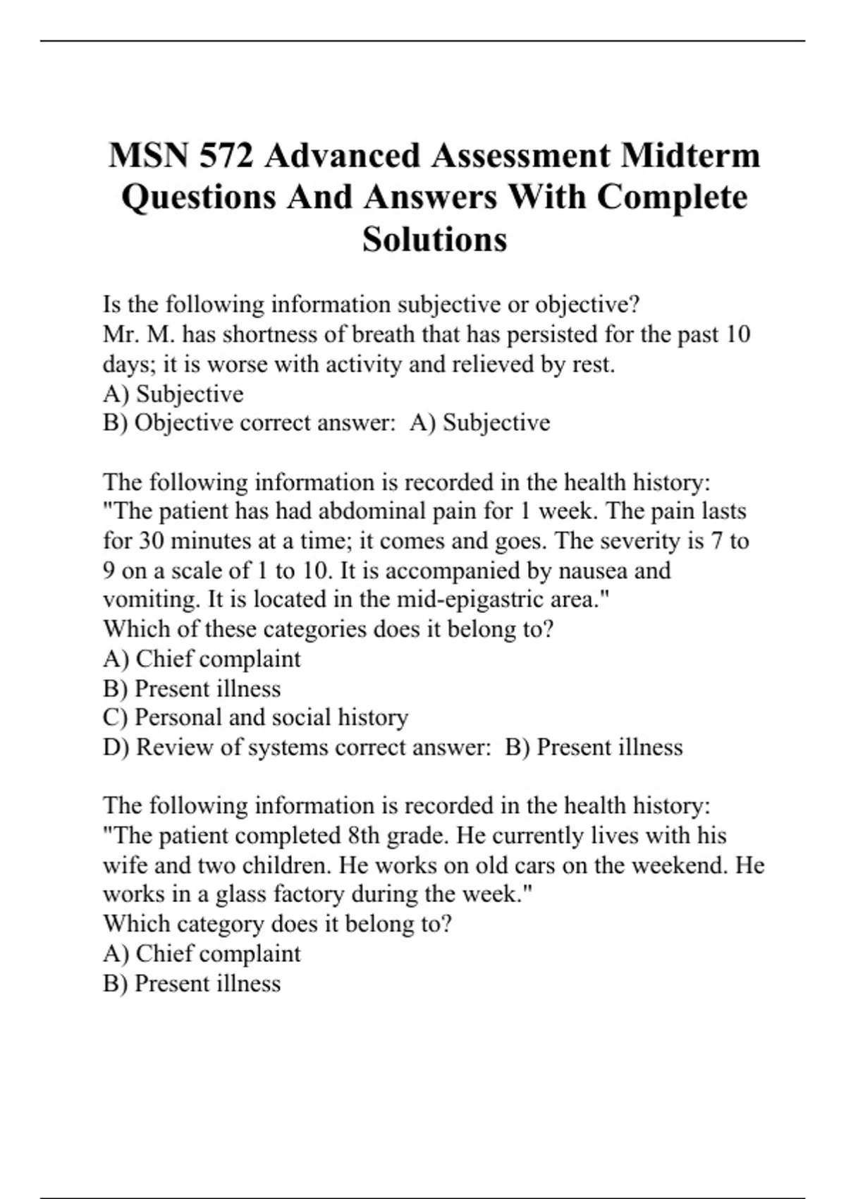 Is the following information subjective or objective? Mr. M. has shortness of breath that has persisted for the past 10 days; it is worse with activity and relieved by rest. A) Subjective B) Objective correct answer: A) Subjective The following information is recorded in the health history: "The patient has had abdominal pain for 1 week. The pain lasts for 30 minutes at a time; it comes and goes. The severity is 7 to 9 on a scale of 1 to 10. It is accompanied by nausea and vomiting. It is located in the mid-epigastric area." Which of these categories does it belong to? A) Chief complaint B) Present illness C) Personal and social history D) Review of systems correct answer: B) Present illness The following information is recorded in the health history: "The patient completed 8th grade. He currently lives with his wife and two children. He works on old cars on the weekend. He works in a glass factory during the week." Which category does it belong to? A) Chief complaint B) Present illness C) Personal and social history D) Review of systems correct answer: C) Personal and social history The following information is recorded in the health history: "I feel really tired." Which category does it belong to? A) Chief complaint