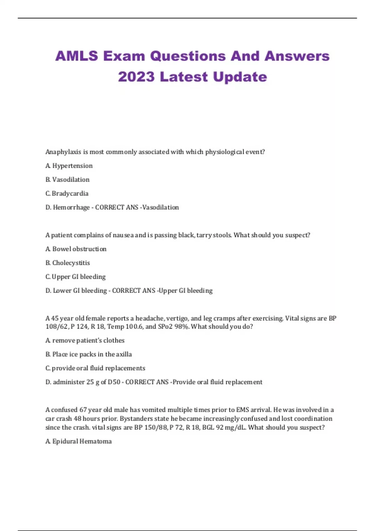 AMLS Exam Questions And Answers 2023 Latest Update Anaphylaxis is most commonly associated with which physiological event? A. Hypertension B. Vasodilation C. Bradycardia D. Hemorrhage - CORRECT ANS -Vasodilation A patient complains of nausea and is passing black, tarry stools. What should you suspect? A. Bowel obstruction B. Cholecystitis C. Upper GI bleeding D. Lower GI bleeding - CORRECT ANS -Upper GI bleeding A 45 year old female reports a headache, vertigo, and leg cramps after exercising. Vital signs are BP 108/62, P 124, R 18, Temp 100.6, and SPo2 98%. What should you do? A. remove patient’s clothes B. Place ice packs in the axilla C. provide oral fluid replacements D. administer 25 g of D50 - CORRECT ANS -Provide oral fluid replacement A confused 67 year old male has vomited multiple times prior to EMS arrival. He was involved in a car crash 48 hours prior. Bystanders state he became increasingly confused and lost coordination since the crash. vital signs are BP 150/88, P 72, R 18, BGL 92 mg/dL. What should you suspect? A. Epidural Hematoma B. Subdural hematoma C. Carotid dissection D. Absence seizure - CORRECT ANS -Subdural Hematoma A 44 year old female complains of a sudden onset of sharp pain in her right flank that radiates to her groin area. Intermittently the pain becomes very severe. She also reports nausea. Vital signs are BP 152/92, P 104, R 16, SpO2 98%. What is the most likely cause? A. Diverticulitis B. Crohn's disease C. Acute hepatitis D. Kidney Stones - CORRECT ANS -Kidney Stones