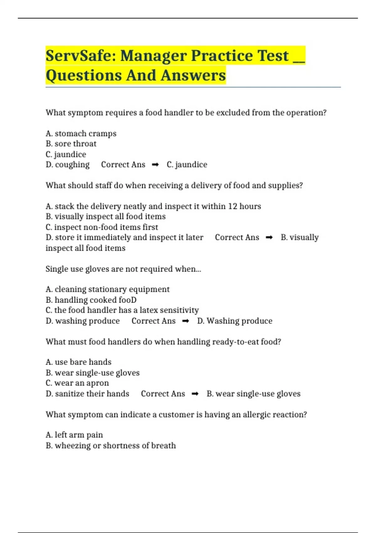 ServSafe: Manager Practice Test __ Questions And Answers
