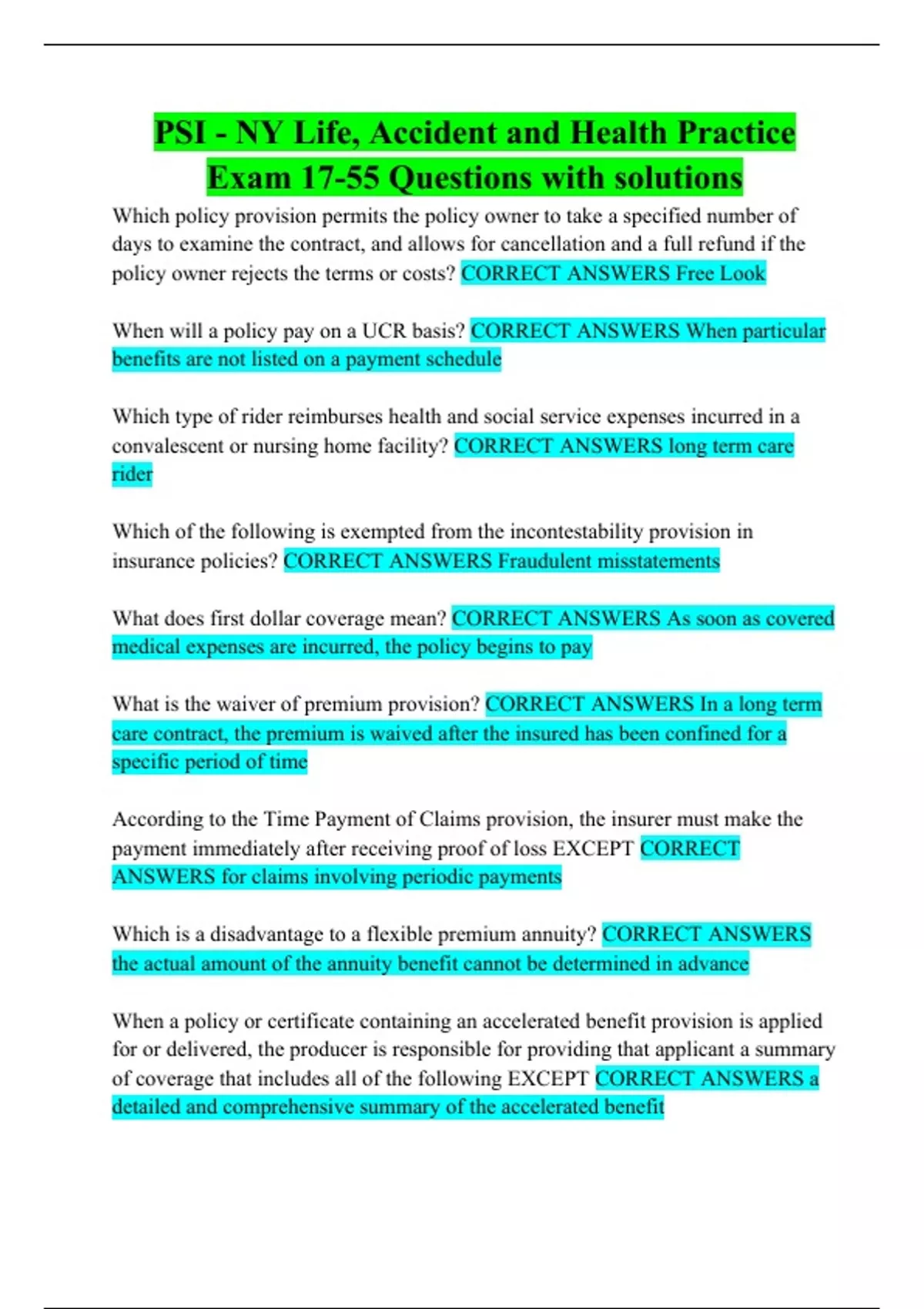 PSI - NY Life, Accident and Health Practice Exam 17-55 Questions with solutions