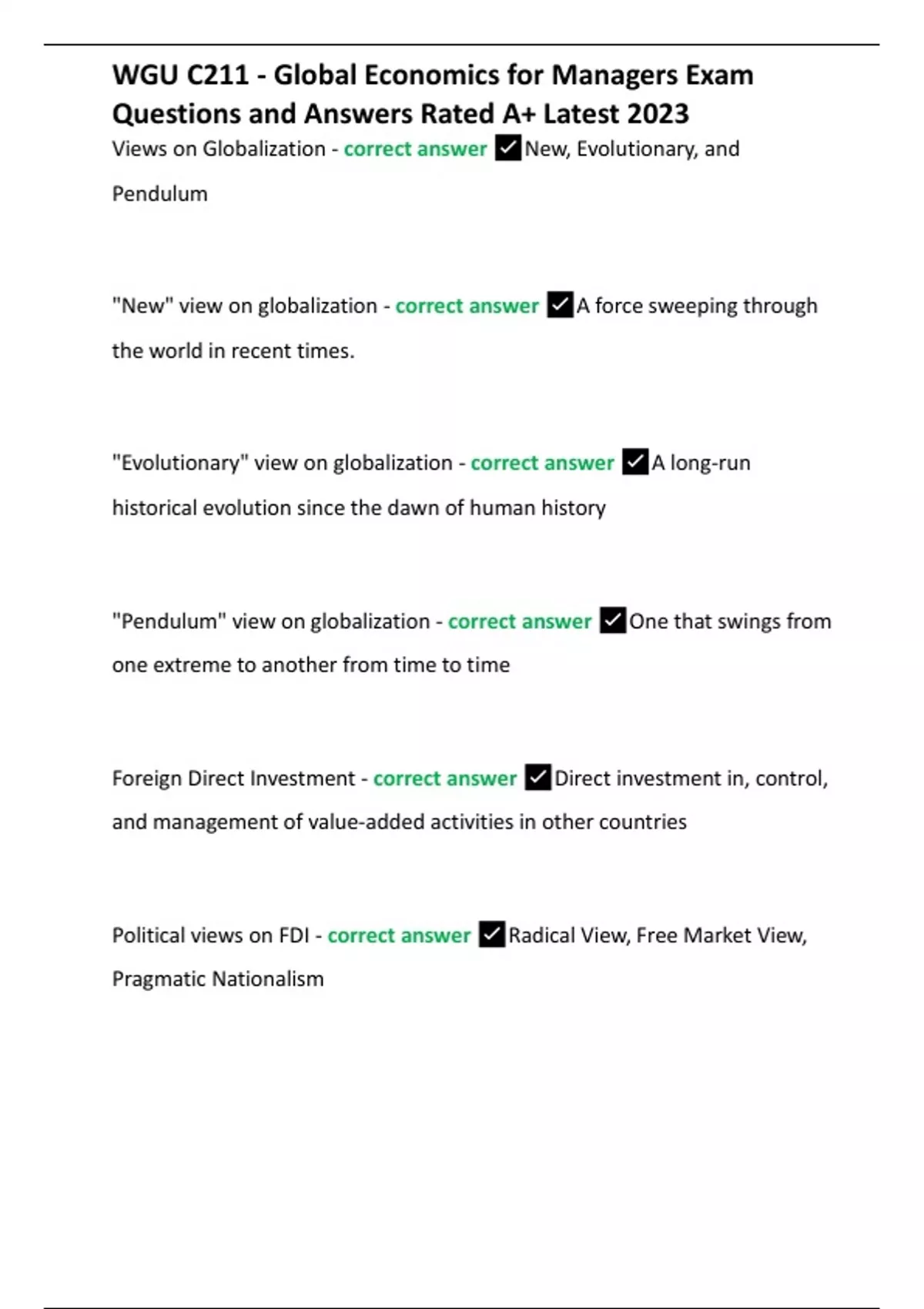 WGU C211 - Global Economics for Managers Exam Questions and Answers Rated A+ Latest 2023 Views on Globalization - correct answer New, Evolutionary, and Pendulum "New" view on globalization - correct answer A force sweeping through the world in recent times. "Evolutionary" view on globalization - correct answer A long-run historical evolution since the dawn of human history "Pendulum" view on globalization - correct answer One that swings from one extreme to another from time to time Foreign Direct Investment - correct answer Direct investment in, control, and management of value-added activities in other countries Political views on FDI - correct answer Radical View, Free Market View, Pragmatic Nationalism Benefits to a country receiving FDI - correct answer Capital Inflow, Technology Spillover, Advanced Management Know-How, Job creation Costs to a country receiving FDI - correct answer Loss of Sovereignty, Adverse effects on competition, Capital outflow. How do resources and capabilities influence the competitive dynamics of a business? - correct answer Resource similarity and market commonality can yield a powerful framework for competitor analysis. Resource similarity - correct answer The extent to which a given competitor possesses strategic endowment comparable, in terms of both type and amount, to those of the focal firm. How does resource similarity impact competitive dynamics? - correct answer Firms with a high degree are likely to have similar competitive actions. (Starbuck's instant coffee & McDonald's iced coffee) Classical theories of international trade - correct answer Mercantilism, Absolute advantage, and Comparative advantage