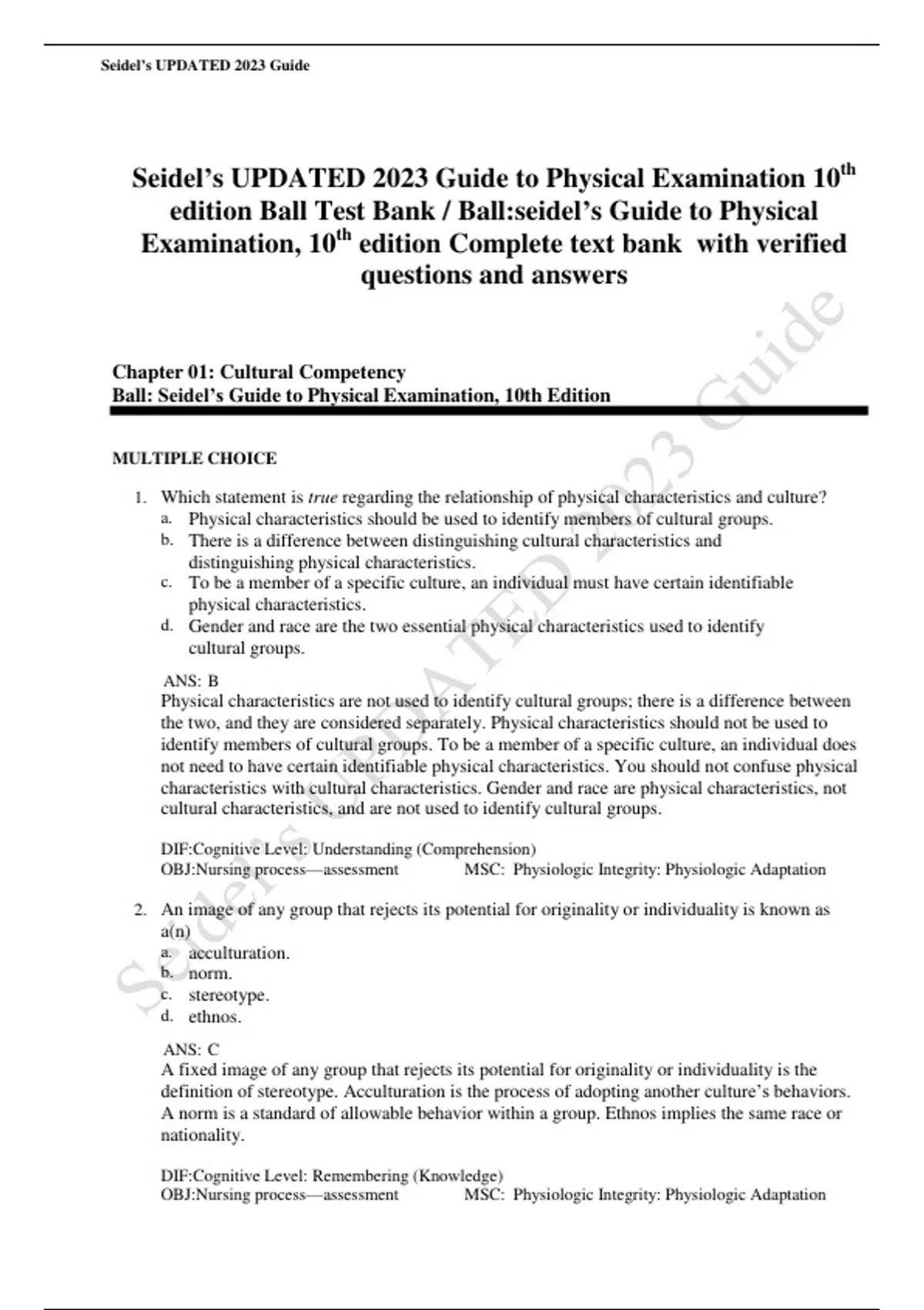 Seidel’s UPDATED 2023 Guide to Physical Examination 10th edition Ball Test Bank / Ball:seidel’s Guide to Physical Examination, 10th edition Complete text bank with verified questions and answers