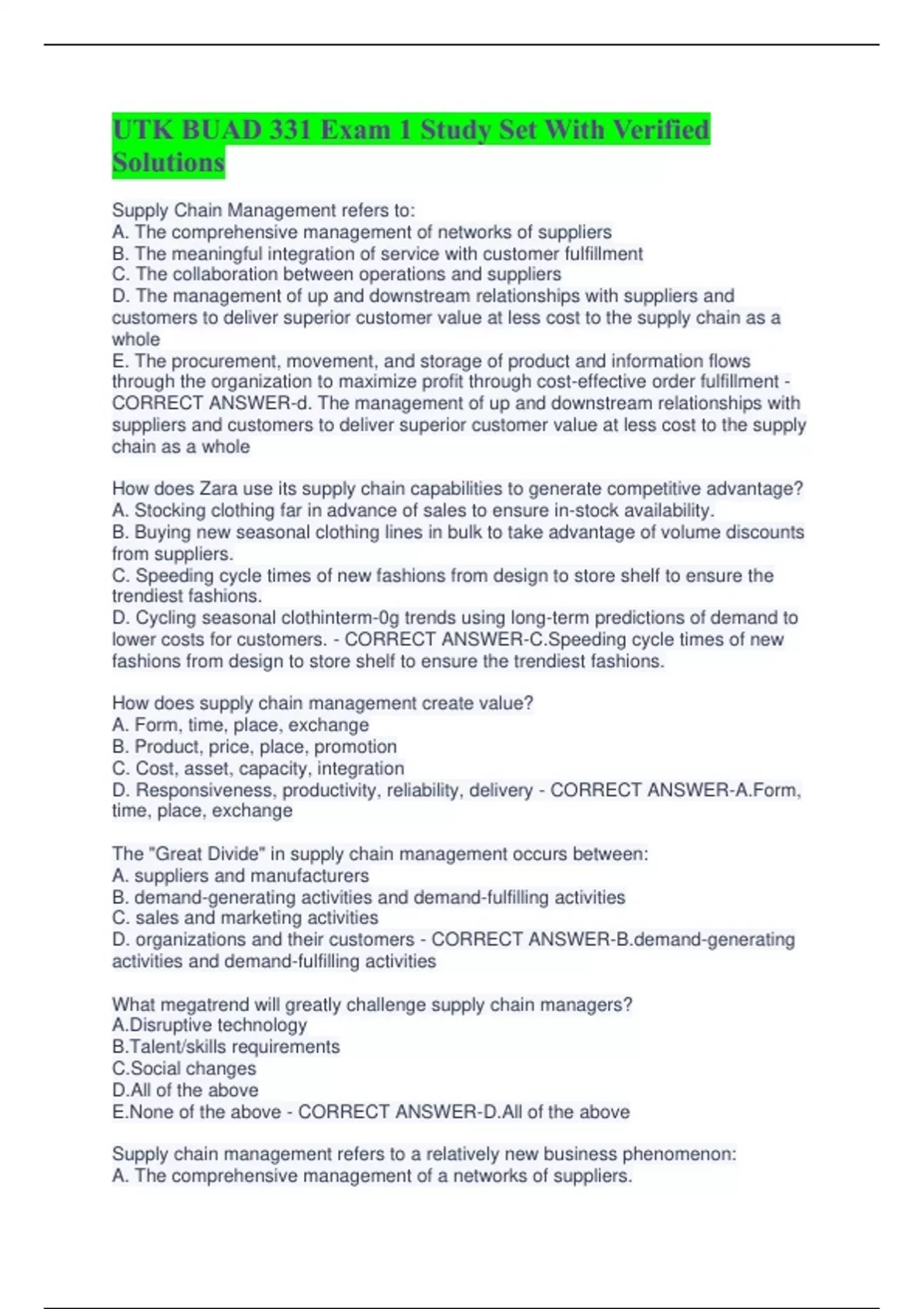 UTK BUAD 331 Exam 1 Study Set With Verified Solutions Supply Chain Management refers to: A. The comprehensive management of networks of suppliers B. The meaningful integration of service with customer fulfillment C. The collaboration between operations and suppliers D. The management of up and downstream relationships with suppliers and customers to deliver superior customer value at less cost to the supply chain as a whole E. The procurement, movement, and storage of product and information flows through the organization to maximize profit through cost-effective order fulfillment - CORRECT ANSWER-d. The management of up and downstream relationships with suppliers and customers to deliver superior customer value at less cost to the supply chain as a whole How does Zara use its supply chain capabilities to generate competitive advantage? A. Stocking clothing far in advance of sales to ensure in-stock availability. B. Buying new seasonal clothing lines in bulk to take advantage of volume discounts from suppliers. C. Speeding cycle times of new fashions from design to store shelf to ensure the trendiest fashions. D. Cycling seasonal clothinterm-0g trends using long-term predictions of demand to lower costs for customers. - CORRECT ANSWER-C.Speeding cycle times of new fashions from design to store shelf to ensure the trendiest fashions. How does supply chain management create value? A. Form, time, place, exchange B. Product, price, place, promotion C. Cost, asset, capacity, integration D. Responsiveness, productivity, reliability, delivery - CORRECT ANSWER-A.Form, time, place, exchange The "Great Divide" in supply chain management occurs between: A. suppliers and manufacturers B. demand-generating activities and demand-fulfilling activities C. sales and marketing activities D. organizations and their customers - CORRECT ANSWER-B.demand-generating activities and demand-fulfilling activities What megatrend will greatly challenge supply chain managers? A.Disruptive technology B.Talent/skills requirements C.Social changes D.All of the above E.None of the above - CORRECT ANSWER-D.All of the above Supply chain management refers to a relatively new business phenomenon: A. The comprehensive management of a networks of suppliers. B. The meaningful integration of service with customer fulfillment. C. The collaboration between operations and suppliers. D. The management of upstream and downstream relationships with suppliers and customers to deliver superior customer value at less cost to the supply chain as a whole. E. The procurement, movement, and storage of product and information flows through the organization to maximize profit through cost-effective order fulfillment. - CORRECT ANSWER-D.The management of upstream and downstream relationships with suppliers and customers to deliver superior customer value at less cost to the supply chain as a whole. Which of the following is not an element of the integrated supply chain for General Mills' Honey Nut Cheerios? A.Dairy cow farmers B.Oat farmers in Iowa C.Union Pacific railroad that moves oats to distributors D.General Mills manufacturing plants E.Ted, who eats Honey Nut Cheerios every morning - CORRECT ANSWER-A.Dairy cow farmers A firm is a recognized cost leader but has a strategic goal to become a cost and service leader. What is one initiative that could be planned and implemented to achieve this goal? A.Increase sales calls to all existing customers. B.Increase capacity utilization to gain economies of scale. C.Award larger employee bonuses to encourage more emphasis on selling. D.Offer customized services to key customers. E.Own every step of the supply chain instead of relying on external customers. - CORRECT ANSWER-D.Offer customized services to key customers. Which economic utilities are associated with supply chain management? A.Form, Time and Place B.Exchange, Time and Place C.Exchange, Time and Place D.Form, Exchange and Time E.Exchange, Time and Value - CORRECT ANSWER-A.Form, Time and Place Which economic reason is NOT a reason for students to buy textbooks on A? A.Form B.Time C.Place D.Exchange - CORRECT ANSWER-A.Form Supply chain management: A. emphasizes optimized advertising and promotion across the organization. B. requires a high level of corporate input in inventory management and production scheduling decisions. C. extends the linking and coordination of materials management, manufacturing management and distribution upstream to suppliers and downstream to customers. D. uses mergers and acquisitions across the supply chain integration to better manage materials flow from suppliers and distribution of end products to the customer. - CORRECT ANSWER-C.extends the linking and coordination of materials management, manufacturing management and distribution upstream to suppliers and downstream to customers Logistics/supply chain management is closely tied with marketing as it typically fills which "P"? A.Price B.Place C.Promotion D.Player - CORRECT ANSWER-B.Place The separation between demand-focused activities and supply-focused activities is sometimes referred to as: A. suppliers and manufacturers B. retailers and consumers C. suppliers competing with each other materials management and manufacturing D. The Great Divide - CORRECT ANSWER-D.The Great Divide Two kinds of customers walk into the Grizzly Fly-Fishing Shop: college freshmen taking a first-time class and high-end professional executives with fishing experience. In order to deliver the most value to each of these customers, John (the store owner) should: A. focus on creating a supply chain that delivers the best average form, time and place value at the lowest average cost. B. focus on creating supply chains that deliver the specific form, time and place utility that each customer segment is looking for, at a price that each segment is willing to pay. C. focus on building enough inventory of both high- and low-end gear, so that he can satisfy either kind of customer who walks 