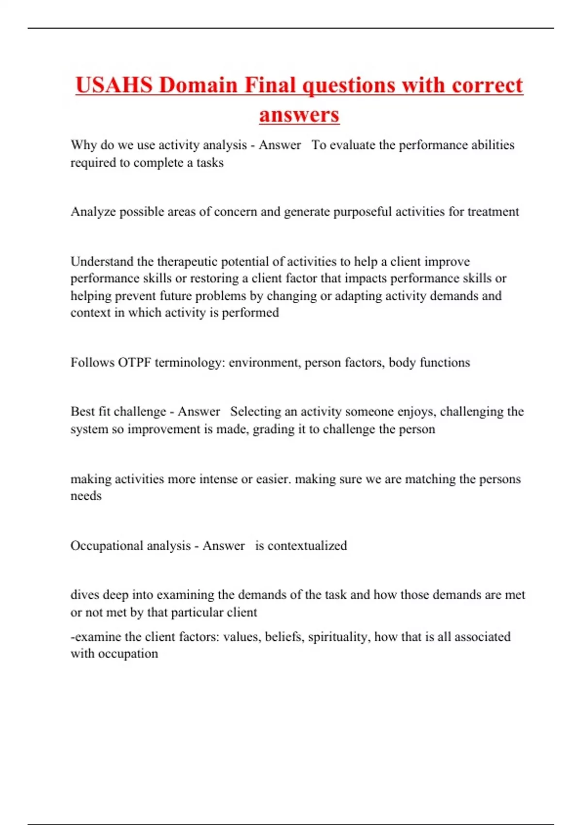 Why do we use activity analysis - Answer To evaluate the performance abilities required to complete a tasks Analyze possible areas of concern and generate purposeful activities for treatment Understand the therapeutic potential of activities to help a client improve performance skills or restoring a client factor that impacts performance skills or helping prevent future problems by changing or adapting activity demands and context in which activity is performed Follows OTPF terminology: environment, person factors, body functions Best fit challenge - Answer Selecting an activity someone enjoys, challenging the system so improvement is made, grading it to challenge the person making activities more intense or easier. making sure we are matching the persons needs Occupational analysis - Answer is contextualized dives deep into examining the demands of the task and how those demands are met or not met by that particular client -examine the client factors: values, beliefs, spirituality, how that is all associated with occupation