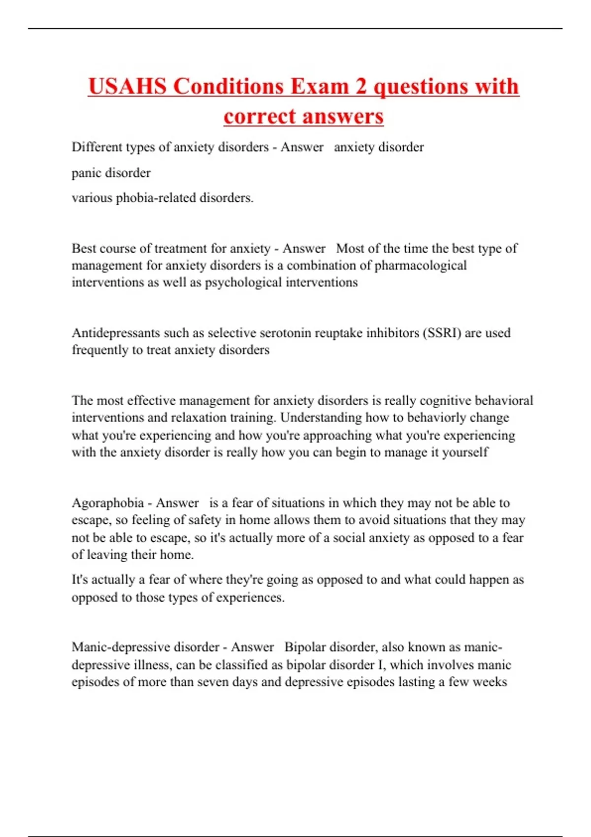 Different types of anxiety disorders - Answer anxiety disorder panic disorder various phobia-related disorders. Best course of treatment for anxiety - Answer Most of the time the best type of management for anxiety disorders is a combination of pharmacological interventions as well as psychological interventions Antidepressants such as selective serotonin reuptake inhibitors (SSRI) are used frequently to treat anxiety disorders The most effective management for anxiety disorders is really cognitive behavioral interventions and relaxation training. Understanding how to behaviorly change what you're experiencing and how you're approaching what you're experiencing with the anxiety disorder is really how you can begin to manage it yourself Agoraphobia - Answer is a fear of situations in which they may not be able to escape, so feeling of safety in home allows them to avoid situations that they may not be able to escape, so it's actually more of a social anxiety as opposed to a fear of leaving their home. It's actually a fear of where they're going as opposed to and what could happen as opposed to those types of experiences. Manic-depressive disorder - Answer Bipolar disorder, also known as manic-depressive illness, can be classified as bipolar disorder I, which involves manic episodes of more than seven days and depressive episodes lasting a few weeks