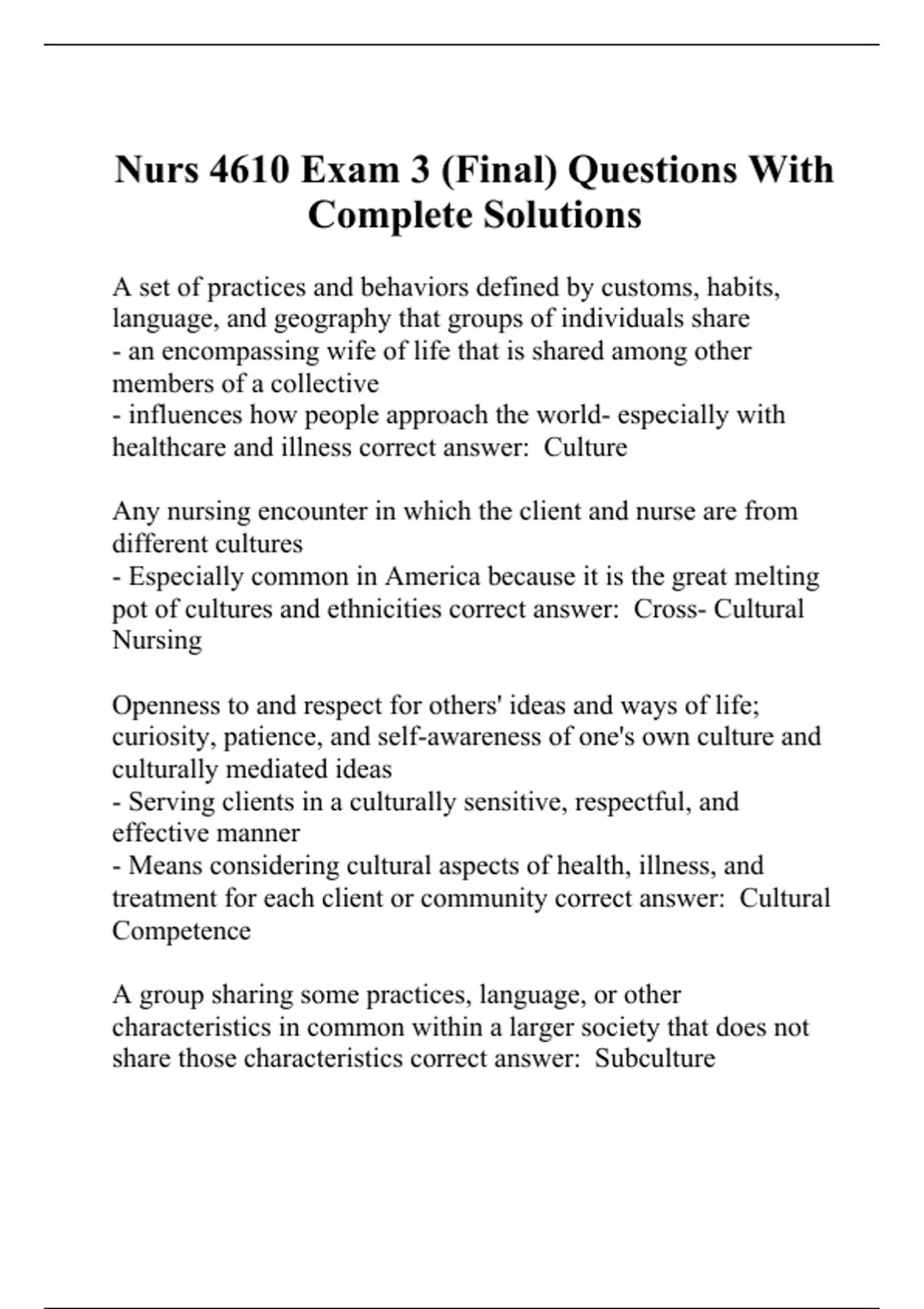 A set of practices and behaviors defined by customs, habits, language, and geography that groups of individuals share - an encompassing wife of life that is shared among other members of a collective - influences how people approach the world- especially with healthcare and illness correct answer: Culture Any nursing encounter in which the client and nurse are from different cultures - Especially common in America because it is the great melting pot of cultures and ethnicities correct answer: Cross- Cultural Nursing Openness to and respect for others' ideas and ways of life; curiosity, patience, and self-awareness of one's own culture and culturally mediated ideas - Serving clients in a culturally sensitive, respectful, and effective manner - Means considering cultural aspects of health, illness, and treatment for each client or community correct answer: Cultural Competence A group sharing some practices, language, or other characteristics in common within a larger society that does not share those characteristics correct answer: Subculture The following are components of what? - dynamic (not static) - shared (not private) - learned (not inherited)