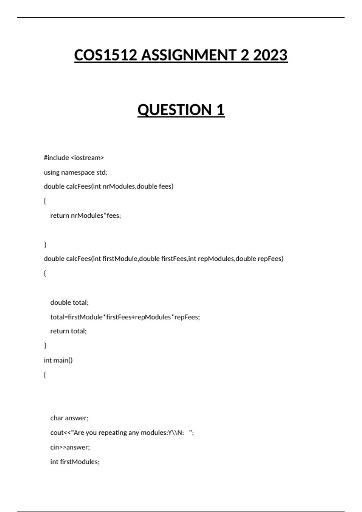 cout<<"Your tuition fees are: R"<<calcFees(firstModules,firstFees,repModule,repFees);