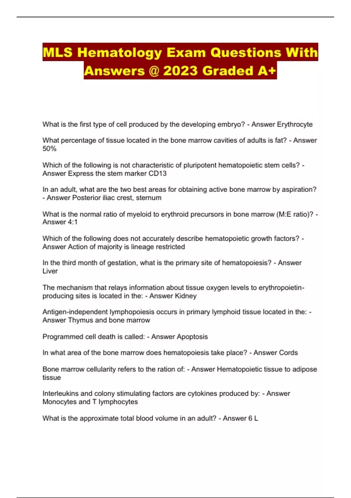 mls hematology exam questions with answers 2023