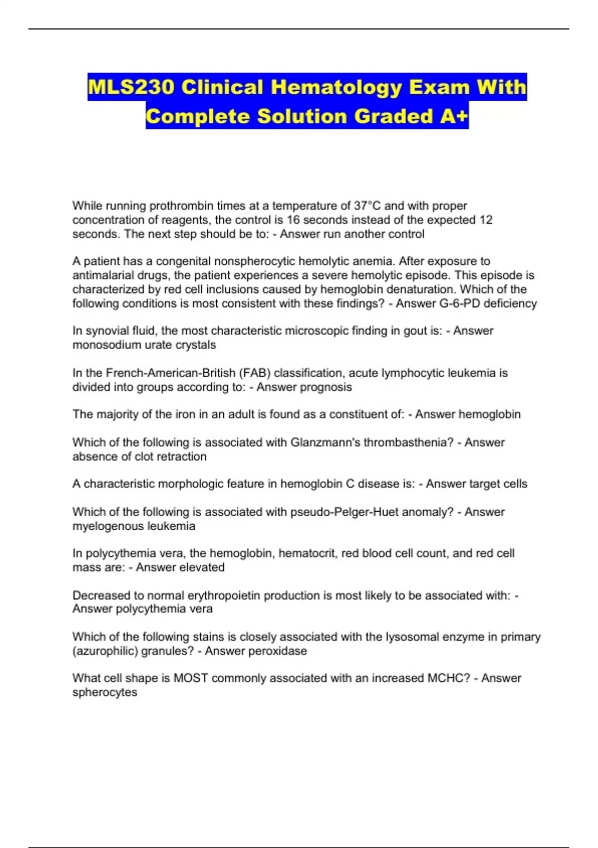 MLS230 Clinical Hematology Exam With Complete Solution Graded A+...