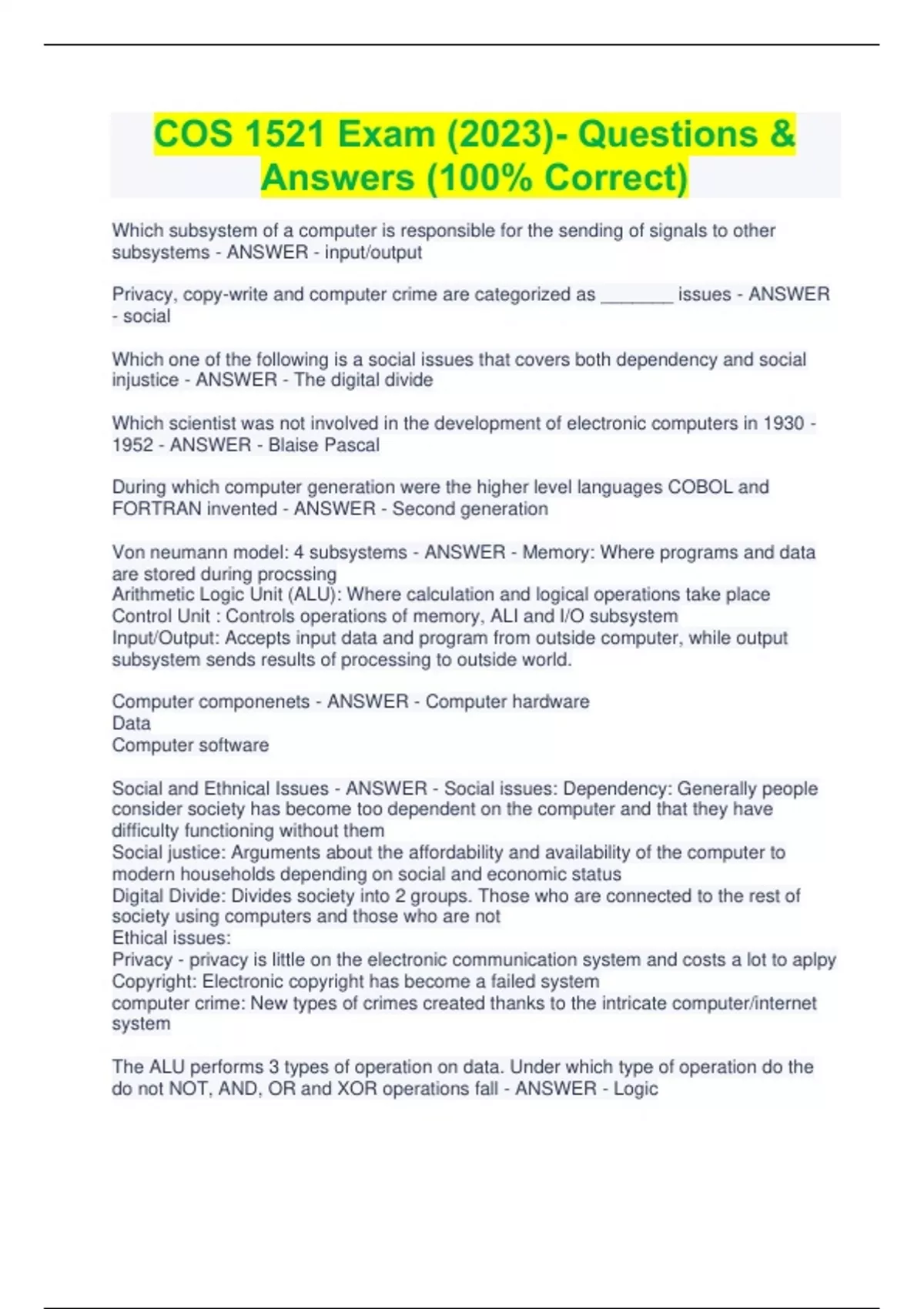 COS 1521 Exam (2023)- Questions & Answers (100% Correct) COS 1521 Exam (2023)- Questions & Answers (100% Correct) Which subsystem of a computer is responsible for the sending of signals to other subsystems - ANSWER - input/output Privacy, copy-write and computer crime are categorized as _______ issues - ANSWER - social Which one of the following is a social issues that covers both dependency and social injustice - ANSWER - The digital divide Which scientist was not involved in the development of electronic computers in - ANSWER - Blaise Pascal During which computer generation were the higher level languages COBOL and FORTRAN invented - ANSWER - Second generation Von neumann model: 4 subsystems - ANSWER - Memory: Where programs and data are stored during procssing Arithmetic Logic Unit (ALU): Where calculation and logical operations take place Control Unit : Controls operations of memory, ALI and I/O subsystem Input/Output: Accepts input data and program from outside computer, while output subsystem sends results of processing to outside world. Computer componenets - ANSWER - Computer hardware Data Computer software Social and Ethnical Issues - ANSWER - Social issues: Dependency: Generally people consider society has become too dependent on the computer and that they have difficulty functioning without them Social justice: Arguments about the affordability and availability of the computer to modern households depending on social and economic status Digital Divide: Divides society into 2 groups. Those who are connected to the rest of society using computers and those who are not Ethical issues: Privacy - privacy is little on the electronic communication system and costs a lot to aplpy Copyright: Electronic copyright has become a failed system computer crime: New types of crimes created thanks to the intricate computer/internet system The ALU performs 3 types of operation on data. Under which type of operation do the do not NOT, AND, OR and XOR operations fall - ANSWER - Logic
