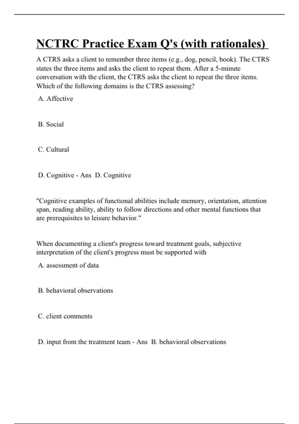 A CTRS asks a client to remember three items (e.g., dog, pencil, book). The CTRS states the three items and asks the client to repeat them. After a 5-minute conversation with the client, the CTRS asks the client to repeat the three items. Which of the following domains is the CTRS assessing? A. Affective B. Social C. Cultural D. Cognitive - Ans D. Cognitive "Cognitive examples of functional abilities include memory, orientation, attention span, reading ability, ability to follow directions and other mental functions that are prerequisites to leisure behavior." When documenting a client's progress toward treatment goals, subjective interpretation of the client's progress must be supported with A. assessment of data B. behavioral observations C. client comments