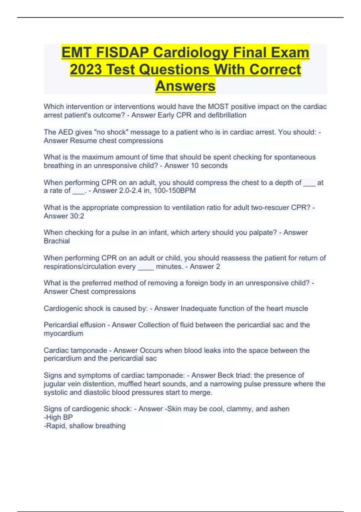 EMT FISDAP Cardiology Final Exam 2023 Test Questions With Correct Answers