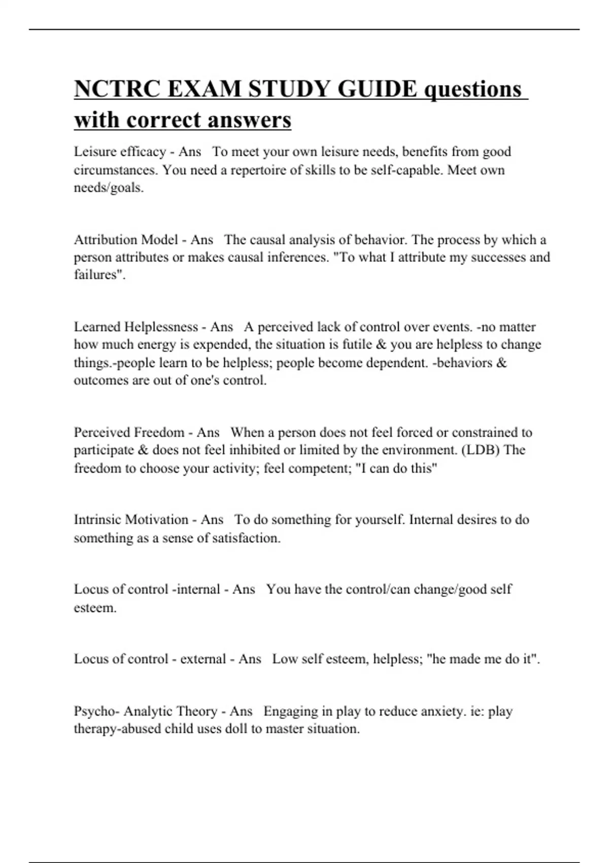 Leisure efficacy - Ans To meet your own leisure needs, benefits from good circumstances. You need a repertoire of skills to be self-capable. Meet own needs/goals. Attribution Model - Ans The causal analysis of behavior. The process by which a person attributes or makes causal inferences. "To what I attribute my successes and failures". Learned Helplessness - Ans A perceived lack of control over events. -no matter how much energy is expended, the situation is futile & you are helpless to change things.-people learn to be helpless; people become dependent. -behaviors & outcomes are out of one's control. Perceived Freedom - Ans When a person does not feel forced or constrained to participate & does not feel inhibited or limited by the environment. (LDB) The freedom to choose your activity; feel competent; "I can do this" Intrinsic Motivation - Ans To do something for yourself. Internal desires to do something as a sense of satisfaction. Locus of control -internal - Ans You have the control/can change/good self esteem. Locus of control - external - Ans Low self esteem, helpless; "he made me do it". Psycho- Analytic Theory - Ans Engaging in play to reduce anxiety. ie: play therapy-abused child uses doll to master situation.