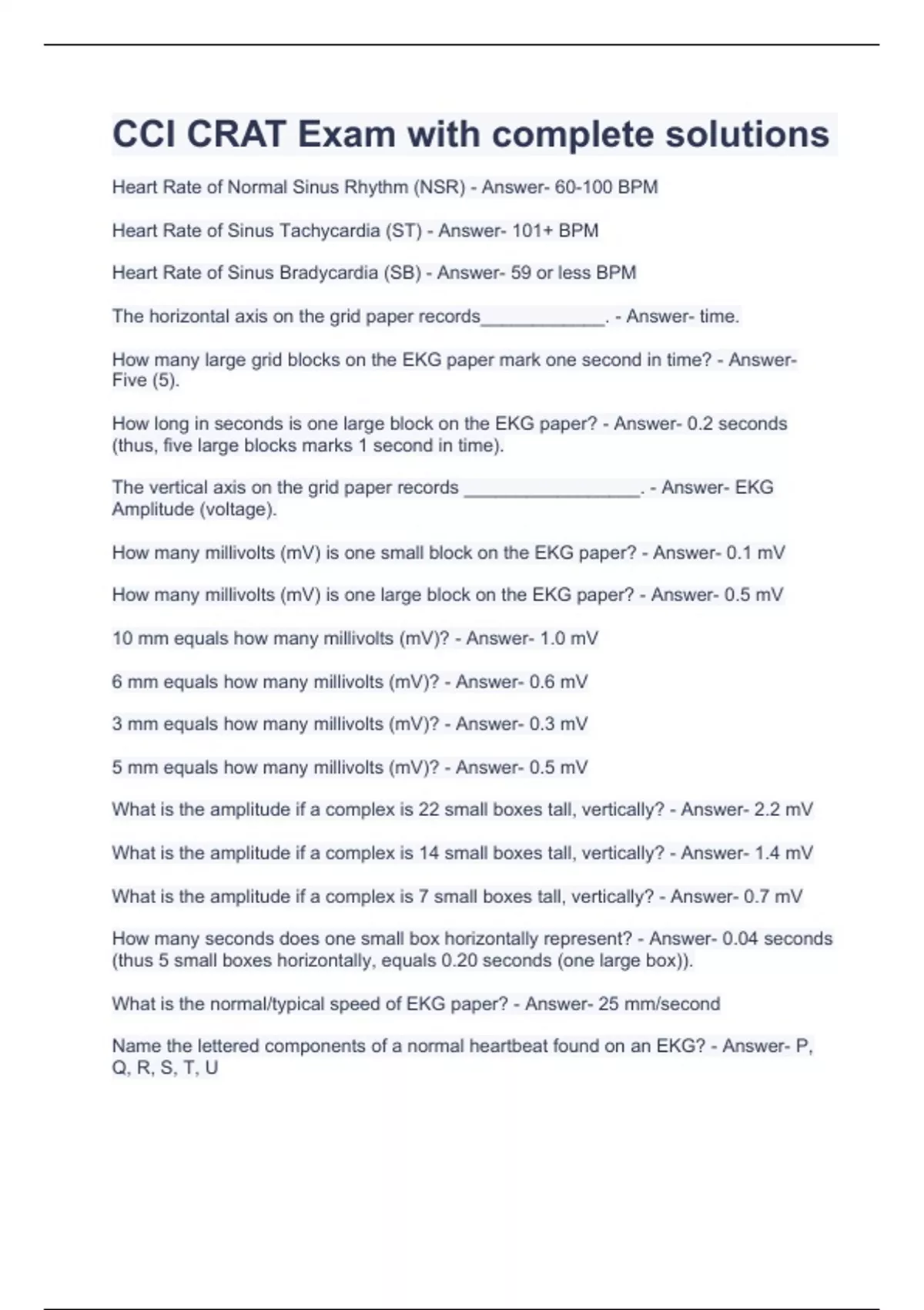 Heart Rate of Normal Sinus Rhythm (NSR) - Answer- 60-100 BPM Heart Rate of Sinus Tachycardia (ST) - Answer- 101+ BPM Heart Rate of Sinus Bradycardia (SB) - Answer- 59 or less BPM The horizontal axis on the grid paper records____________. - Answer- time. How many large grid blocks on the EKG paper mark one second in time? - Answer- Five (5). How long in seconds is one large block on the EKG paper? - Answer- 0.2 seconds (thus, five large blocks marks 1 second in time). The vertical axis on the grid paper records _________________. - Answer- EKG Amplitude (voltage). How many millivolts (mV) is one small block on the EKG paper? - Answer- 0.1 mV How many millivolts (mV) is one large block on the EKG paper? - Answer- 0.5 mV 10 mm equals how many millivolts (mV)? - Answer- 1.0 mV 6 mm equals how many millivolts (mV)? - Answer- 0.6 mV 3 mm equals how many millivolts (mV)? - Answer- 0.3 mV 5 mm equals how many millivolts (mV)? - Answer- 0.5 mV What is the amplitude if a complex is 22 small boxes tall, vertically? - Answer- 2.2 mV What is the amplitude if a complex is 14 small boxes tall, vertically? - Answer- 1.4 mV What is the amplitude if a complex is 7 small boxes tall, vertically? - Answer- 0.7 mV How many seconds does one small box horizontally represent? - Answer- 0.04 seconds (thus 5 small boxes horizontally, equals 0.20 seconds (one large box)). What is the normal/typical speed of EKG paper? - Answer- 25 mm/second Name the lettered components of a normal heartbeat found on an EKG? - Answer- P, Q, R, S, T, U What is a P-wave and what does it represent in a heart beat? - Answer- The first deflection. Normally positive (upward) waveform. Indicates atrial depolarization. What follows a p-wave on an EKG tracing? - Answer- A QRS Complex. What does a QRS complex represent? - Answer- Ventricular Depolarization What is a t-wave and what does it represent in a heart beat? - Answer- A "normally" modest positive (upward) waveform. Indicates ventricular repolarization. What is a U-wave? - Answer- Follows the t-wave. Represents recovery of the Purkinje fibers. Important: May not be observable on an EKG tracing. The "Zoll Way" to assist with Rhythm interpretation (REMEMBER TO HELP WITH INTERPRETATION ON THE EXAM): - Answer- Rhythm Rate P Wave PR Interval QRS Interval T Wave How many chambers does the heart have? - Answer- Four (4). The _________________ are the receiving chambers of the heart. - Answer- Atria (Singular: Atrium) The _______________ are the pumping chambers of the heart. - Answer- Ventricles (Singular: Ventricle) What separates the heart into left and right ventricles? - Answer- The Septum