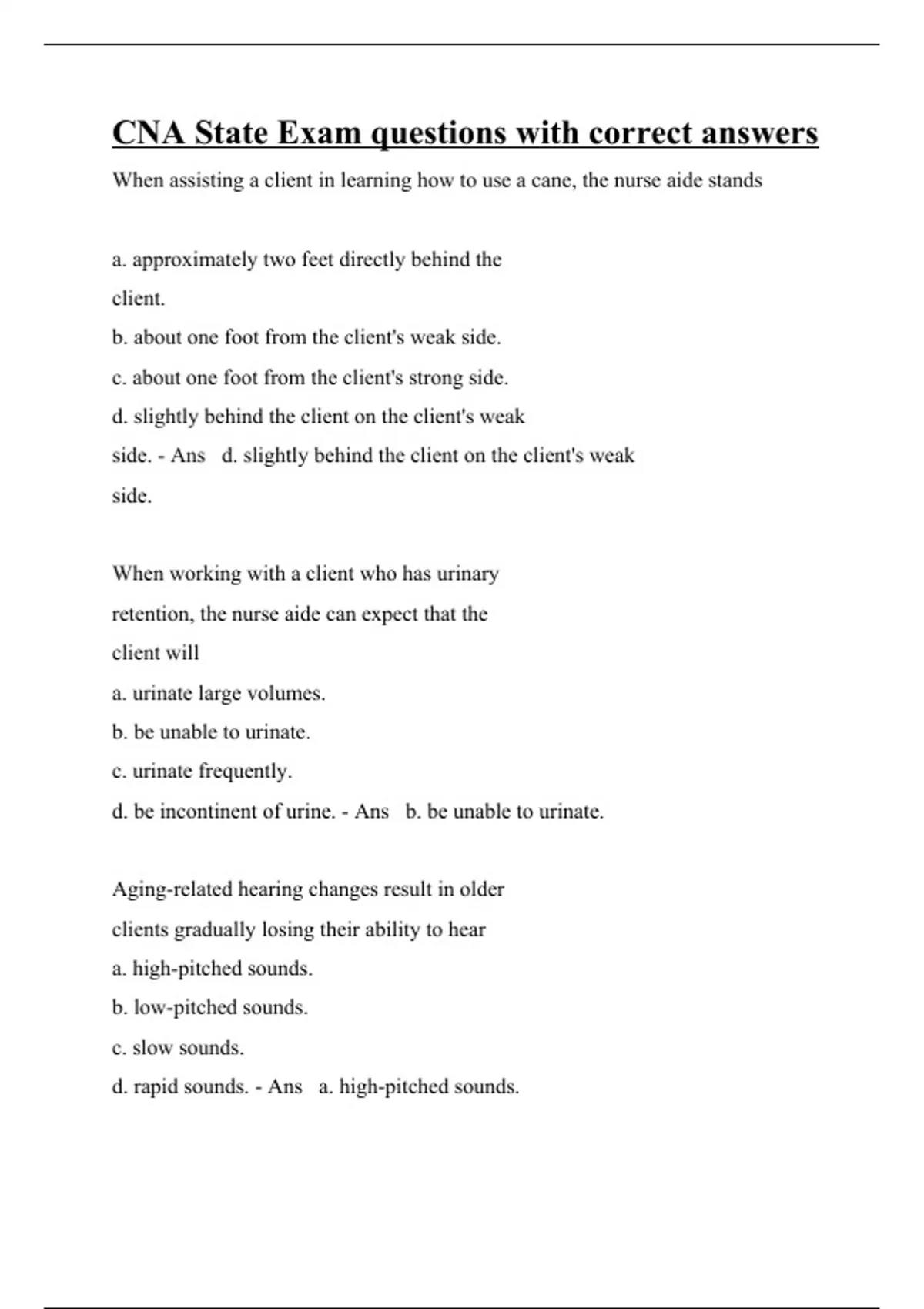 When assisting a client in learning how to use a cane, the nurse aide stands a. approximately two feet directly behind the client. b. about one foot from the client's weak side. c. about one foot from the client's strong side. d. slightly behind the client on the client's weak side. - Ans d. slightly behind the client on the client's weak side. When working with a client who has urinary retention, the nurse aide can expect that the client will a. urinate large volumes. b. be unable to urinate. c. urinate frequently. d. be incontinent of urine. - Ans b. be unable to urinate. Aging-related hearing changes result in older clients gradually losing their ability to hear a. high-pitched sounds. b. low-pitched sounds. c. slow sounds. d. rapid sounds. - Ans a. high-pitched