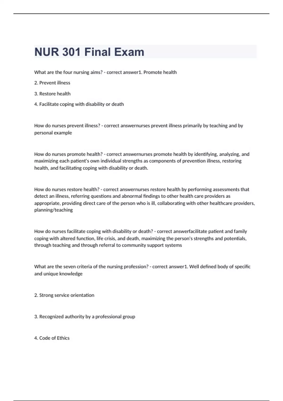 What are the four nursing aims? 1. Promote health 2. Prevent illness 3. Restore health 4. Facilitate coping with disability or death How do nurses prevent illness? nurses prevent illness primarily by teaching and by personal example How do nurse