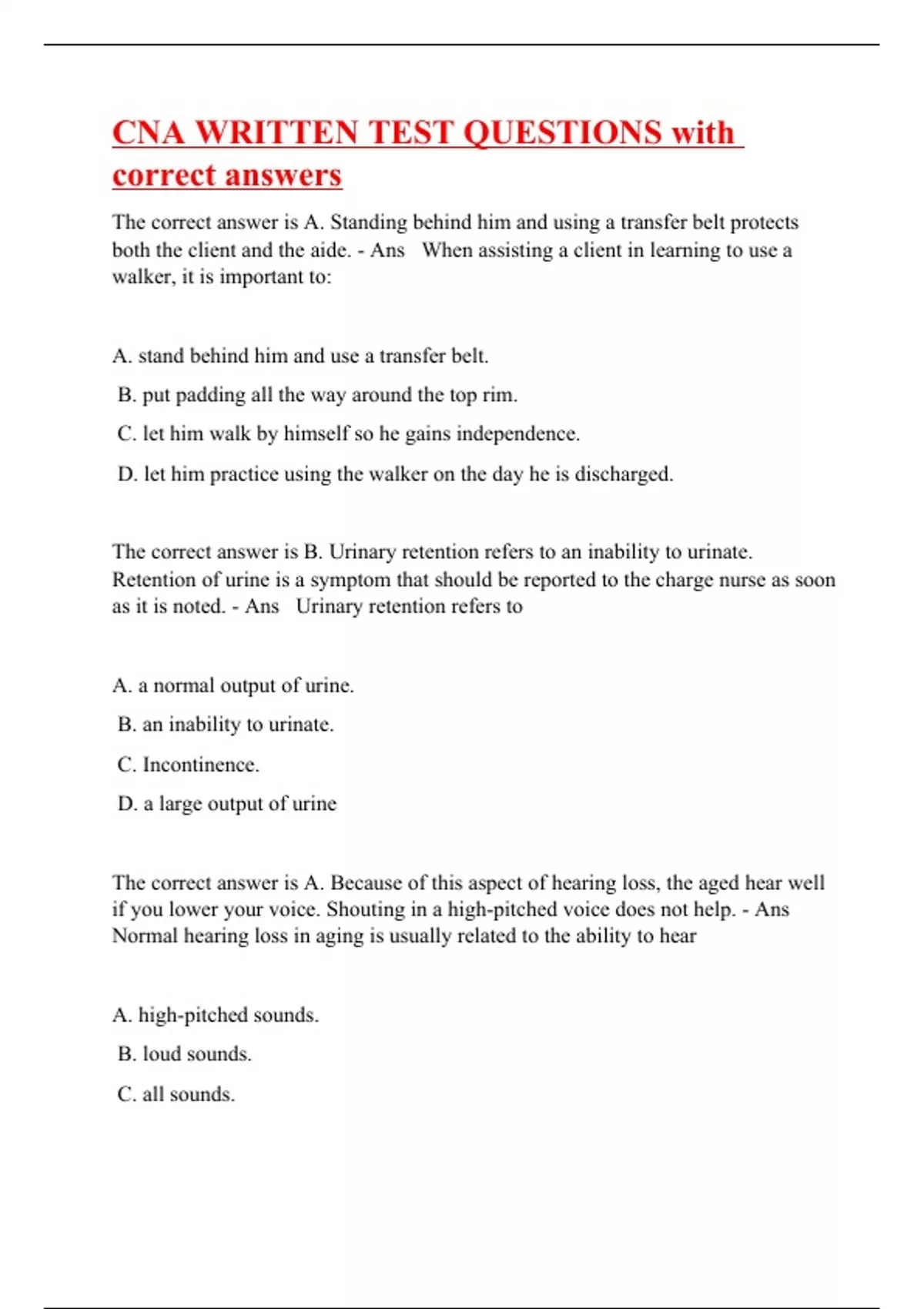 The correct answer is A. Standing behind him and using a transfer belt protects both the client and the aide. - Ans When assisting a client in learning to use a walker, it is important to: A. stand behind him and use a transfer belt. B. put padding all the way around the top rim. C. let him walk by himself so he gains independence. D. let him practice using the walker on the day he is discharged. The correct answer is B. Urinary retention refers to an inability to urinate. Retention of urine is a symptom that should be reported to the charge nurse as soon as it is noted. - Ans Urinary retention refers to A. a normal output of urine. B. an inability to urinate. C. Incontinence. D. a large output of urine The correct answer is A. Because of this aspect of hearing loss, the aged hear well if you lower your voice. Shouting in a high-pitched voice does not help. - Ans Normal hearing loss in aging is usually related