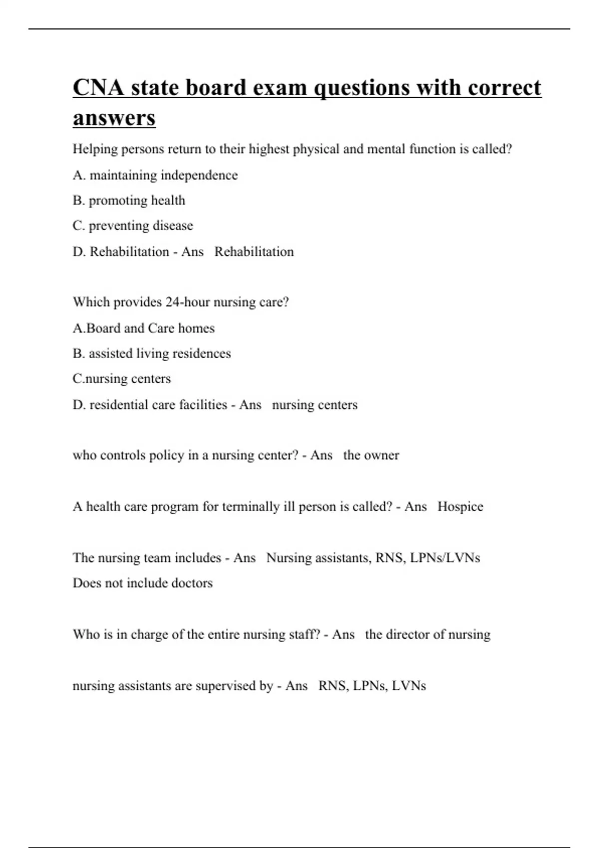 Helping persons return to their highest physical and mental function is called? A. maintaining independence B. promoting health C. preventing disease D. Rehabilitation - Ans Rehabilitation Which provides 24-hour nursing care? A.Board and Care homes B. assisted living residences C.nursing centers D. residential care facilities - Ans nursing centers who controls policy in a nursing center? - Ans the owner A health care program for terminally ill person is called? - Ans Hospice The nursing team includes - Ans Nursing assistants, RNS, LPNs/LVNs Does not include doctors Who is in charge of the entire nursing staff? - Ans the director of nursing
