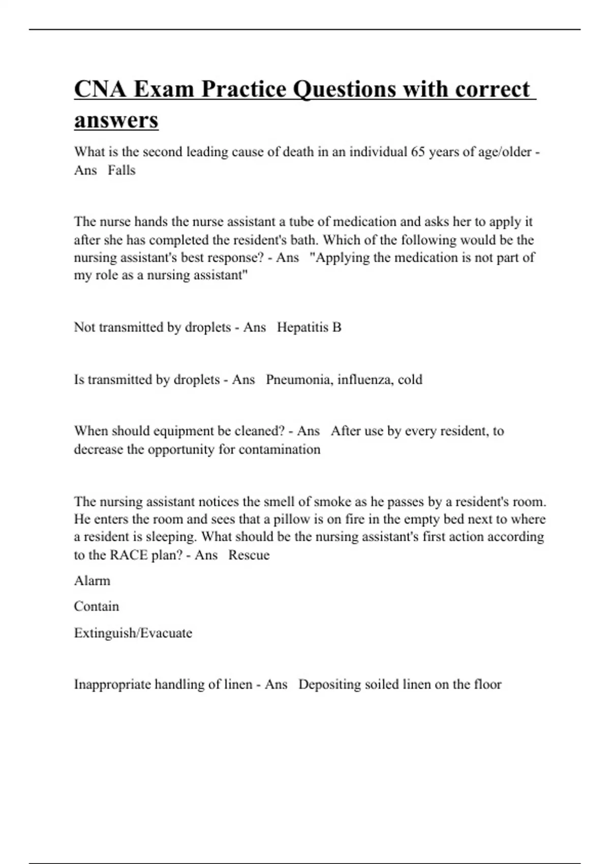 What is the second leading cause of death in an individual 65 years of age/older - Ans Falls The nurse hands the nurse assistant a tube of medication and asks her to apply it after she has completed the resident's bath. Which of the following would be the nursing assistant's best response? - Ans "Applying the medication is not part of my role as a nursing assistant" Not transmitted by droplets - Ans Hepatitis B Is transmitted by droplets - Ans Pneumonia, influenza, cold When should equipment be cleaned? - Ans After use by every resident, to decrease the opportunity for contamination The nursing assistant notices the smell of smoke as he passes by a resident's room. He enters the room and sees that a pillow is on fire in the empty bed next to where a resident is sleeping. What should be the nursing assistant's first action according to the RACE plan? - Ans Rescue Alarm Contain Extinguish/Evacuate Inappropriate handling of linen - Ans Depositing soiled line