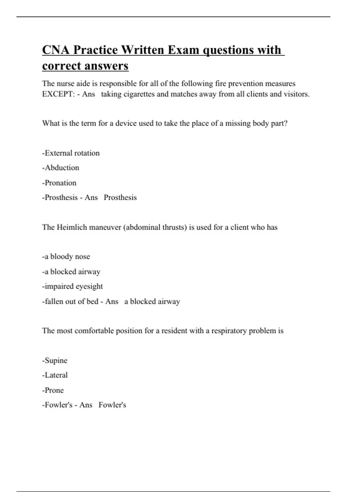 The nurse aide is responsible for all of the following fire prevention measures EXCEPT: - Ans taking cigarettes and matches away from all clients and visitors. What is the term for a device used to take the place of a missing body part? -External rotation -Abduction -Pronation -Prosthesis - Ans Prosthesis The Heimlich maneuver (abdominal thrusts) is used for a client who has -a bloody nose -a blocked airway -impaired eyesight -fallen out of bed - Ans a blocked airway The most comfortable position for a resident with