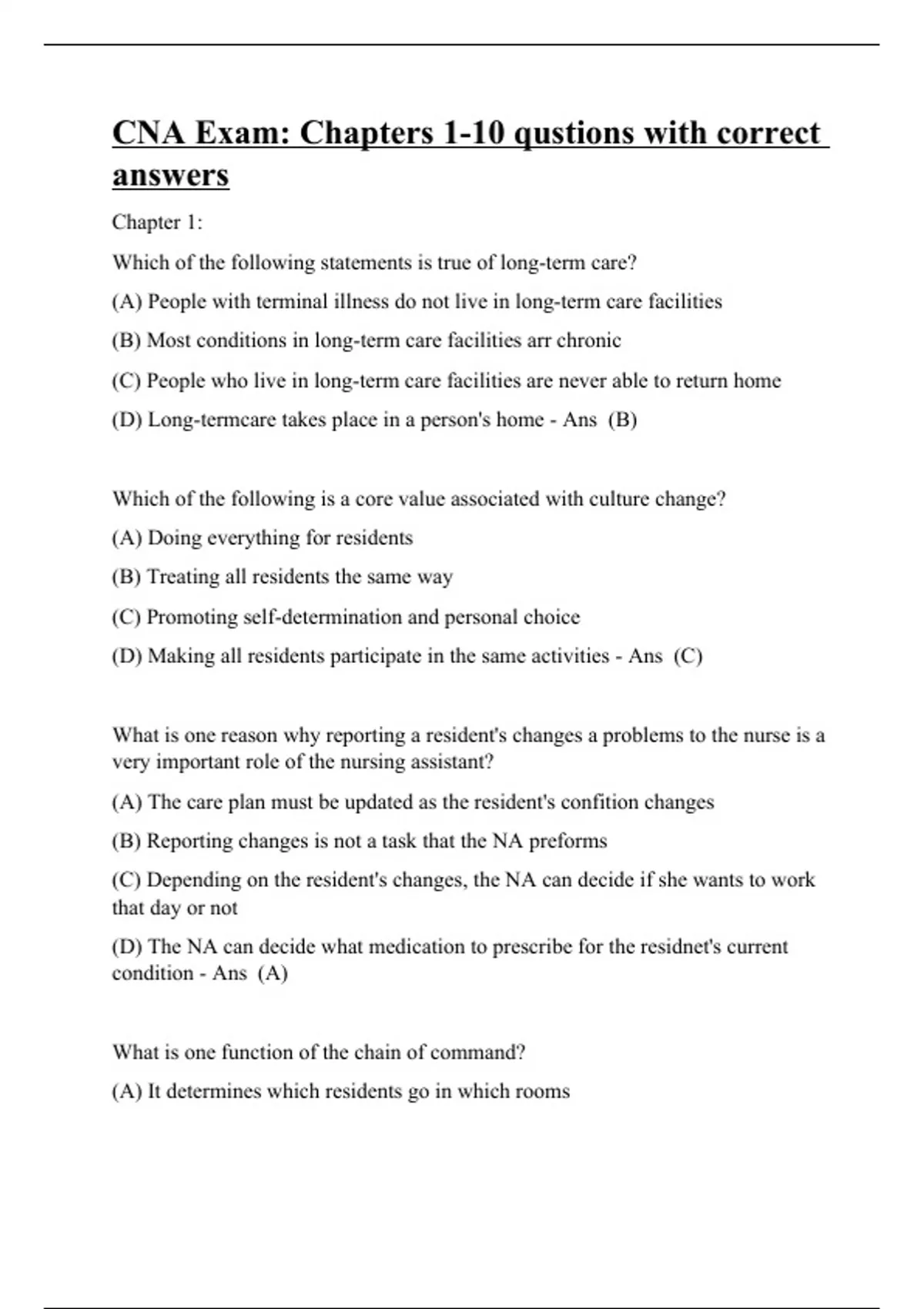 Chapter 1: Which of the following statements is true of long-term care? (A) People with terminal illness do not live in long-term care facilities (B) Most conditions in long-term care facilities arr chronic (C) People who live in long-term care facilities are never able to return home (D) Long-termcare takes place in a person's home - Ans (B) Which of the following is a core value associated with culture change? (A) Doing everything for residents (B) Treating all residents the same way (C) Promoting self-determination and personal choice (D) Making all residents participate in the same activities - Ans (C) What is one reason why reporting a resident's changes a problems to the nurse is a very important role of the nursing assistant? (A) The care plan must be updated as the resident's confition changes (B) Reporting changes is not a task that the NA preforms (C) Depending on the resident's changes, the NA can decide if she wants to work that day or not (D) The NA can decide what medication to prescribe for the residnet's current condition - Ans (A) What is one function of the chain of command?