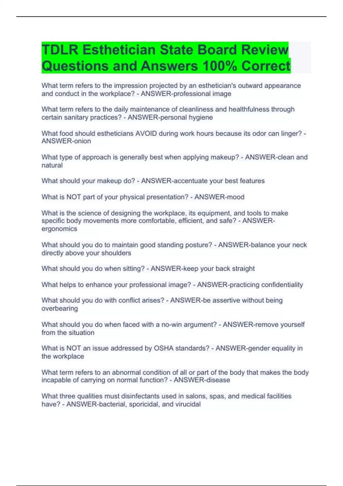 TDLR Esthetician State Board Review Questions and Answers 100% Correct
